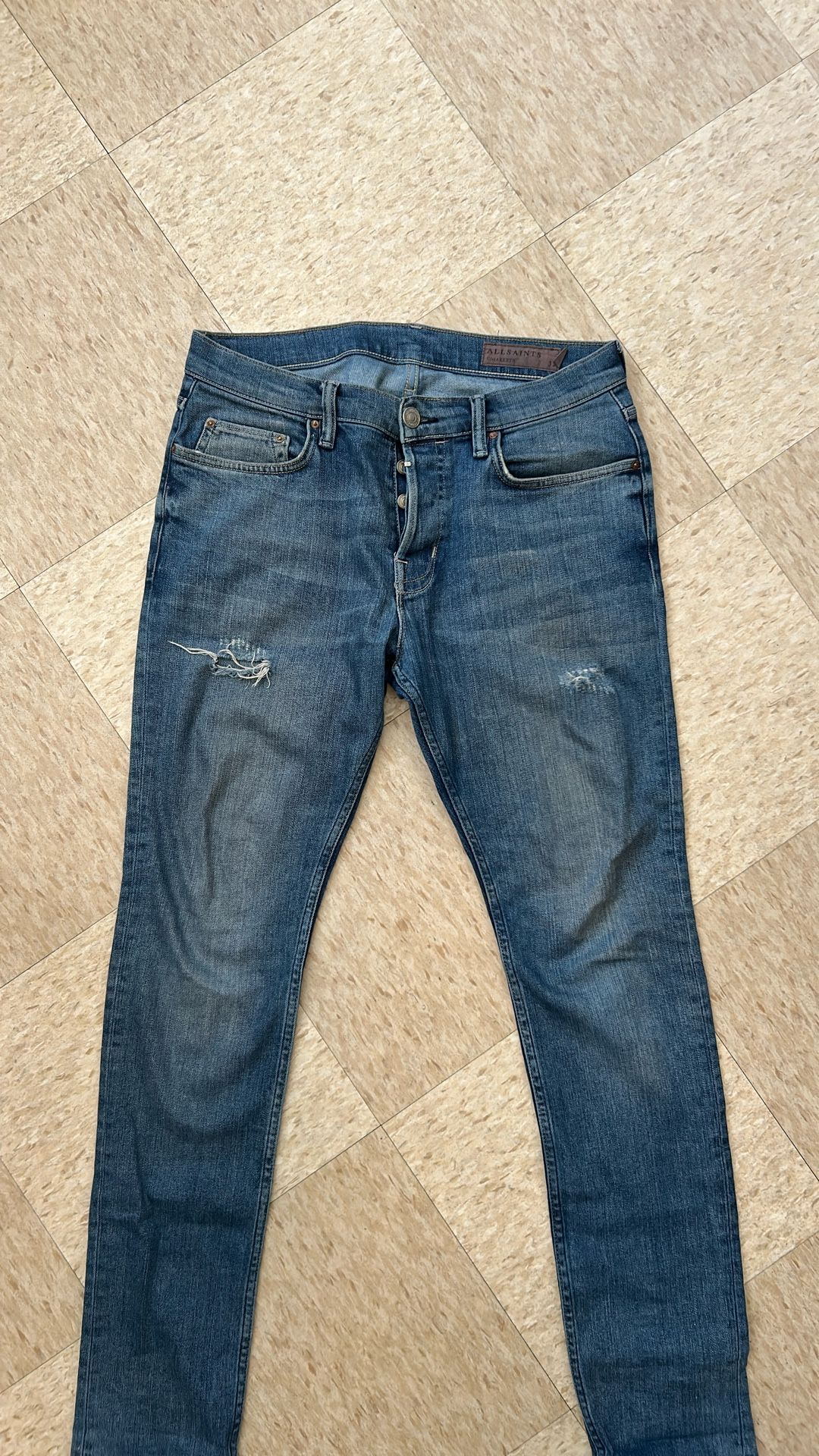 Premium ALLSAINTS denim jeans, slightly destroyed style size 32 perfect for casual wear. No rips or stains.
