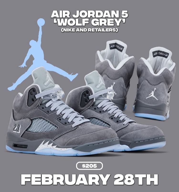 (NiKE and retailers) Fresh Look at the Air Jordan 5 "Wolf Grey" (2026) available in Full-Family sizing.