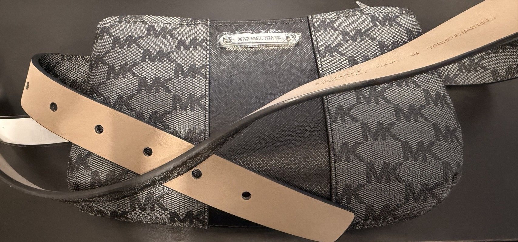 MK Initials Belt Bag - 556137C - S/M Synthetic Materials Two toned Grey/Black MK initials belt and bag with golden top zipper and buckle, one card slot inside, and golden brand on solid black front panel. Bag is approx. 8.5" long and 5.25" wide New, Never used Local Pickup only. Cash or Zelle Only.