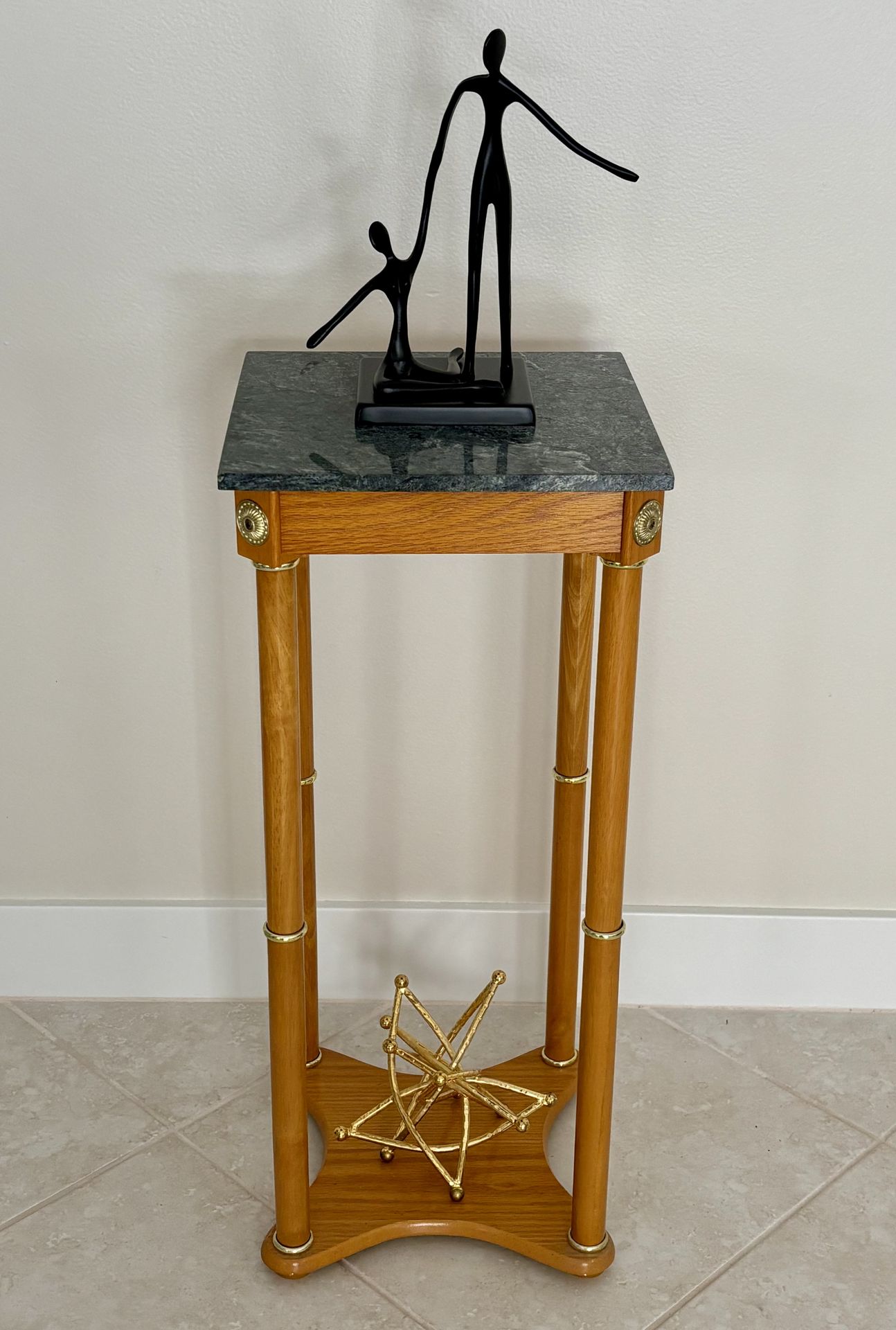 27 1/2”h x 12”w Green marble top wood table with gold accents Use trim Use as display table, plant stand or side table
