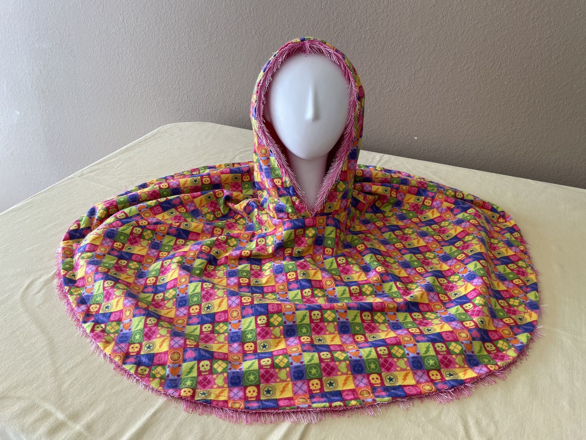 This is for one (1) reversible toddler-child poncho. It’s brand new, made of 100.% cotton flannel, pink polyester eyelash fabric, and washable. Design: Small bright multi-color skeletons and heads. Size: Small (Neck circumference 19-1/2”) Toddler Head circumference (16”-18”) Child Head circumference (18”-20”) PLEASE NOTE: Measure the head circumference before buying to make sure the head will fit through the neck area of poncho (19-1/2”). Pick- up only No delivery or shipping