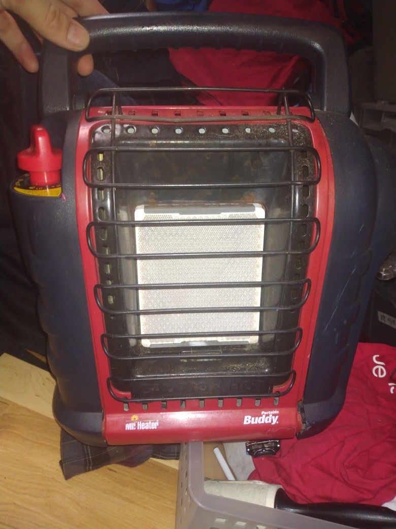 Mr Heater Buddy propane heater works great uses little green propane tanks push button start puts out lot of heat for a little heater I'm asking 30$ I can meet today