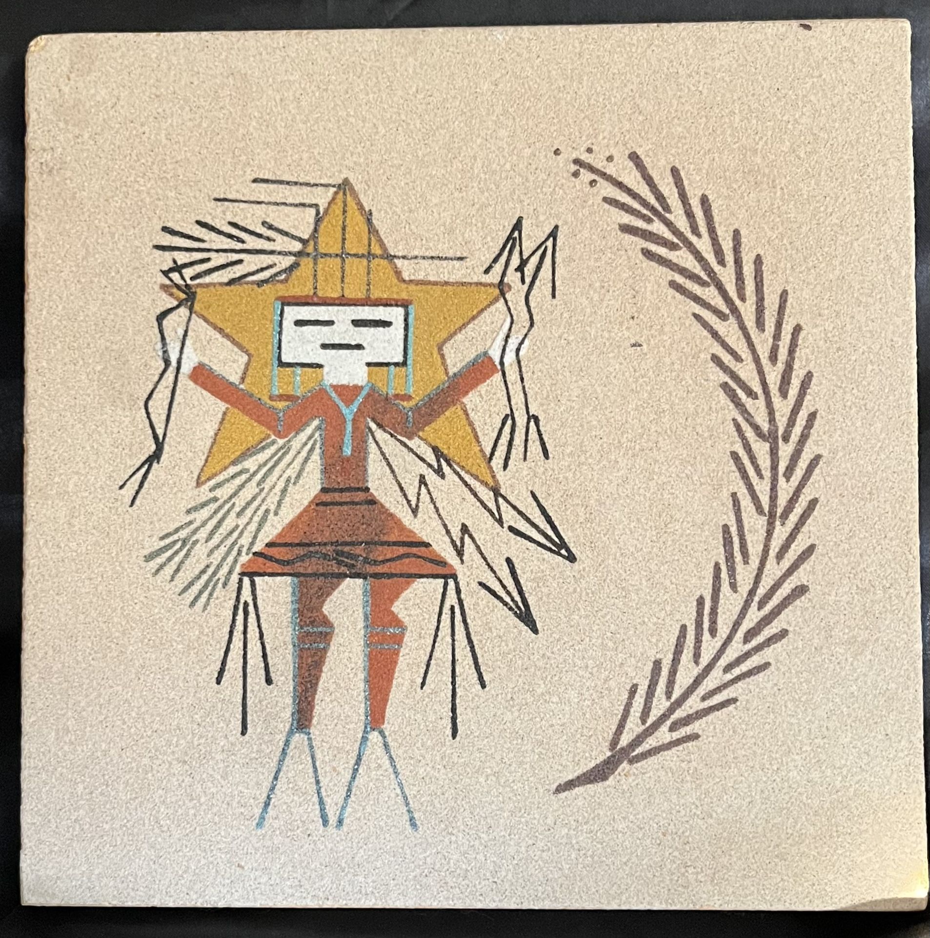 The Holy Boy with Plant signed by C. Henry is a unique Southwestern Navajo sand art piece featuring a bright yellow star, bow, and arrows. Created by Native American artist C. Henry, this artwork embodies traditional Navajo agriculture, planting, nature and culture. Made in the United States, this piece showcases intricate details and vibrant colors that reflect the rich heritage of Native American art. Perfect for collectors interested in unique and culturally significant pieces from the US. 8” x 8” with hanging wire