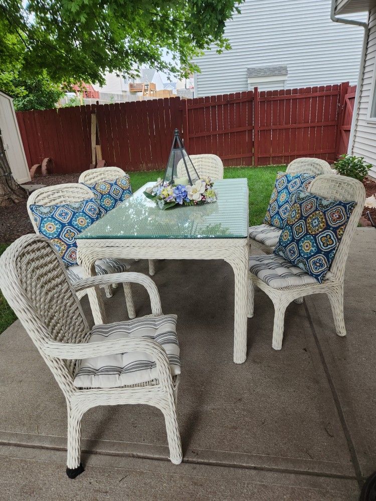 Wicker covered patio / sunroom set, 6 chairs and a with table with solid wood base, Glass-topper for table and 6 indoor cushions, 6 outdoor cushions and lots of pillows. Also included is a gazebo chandelier. This is a very heavy sturdy high-end set. It would be best on a covered patio or sunroom. It is in decent condition.