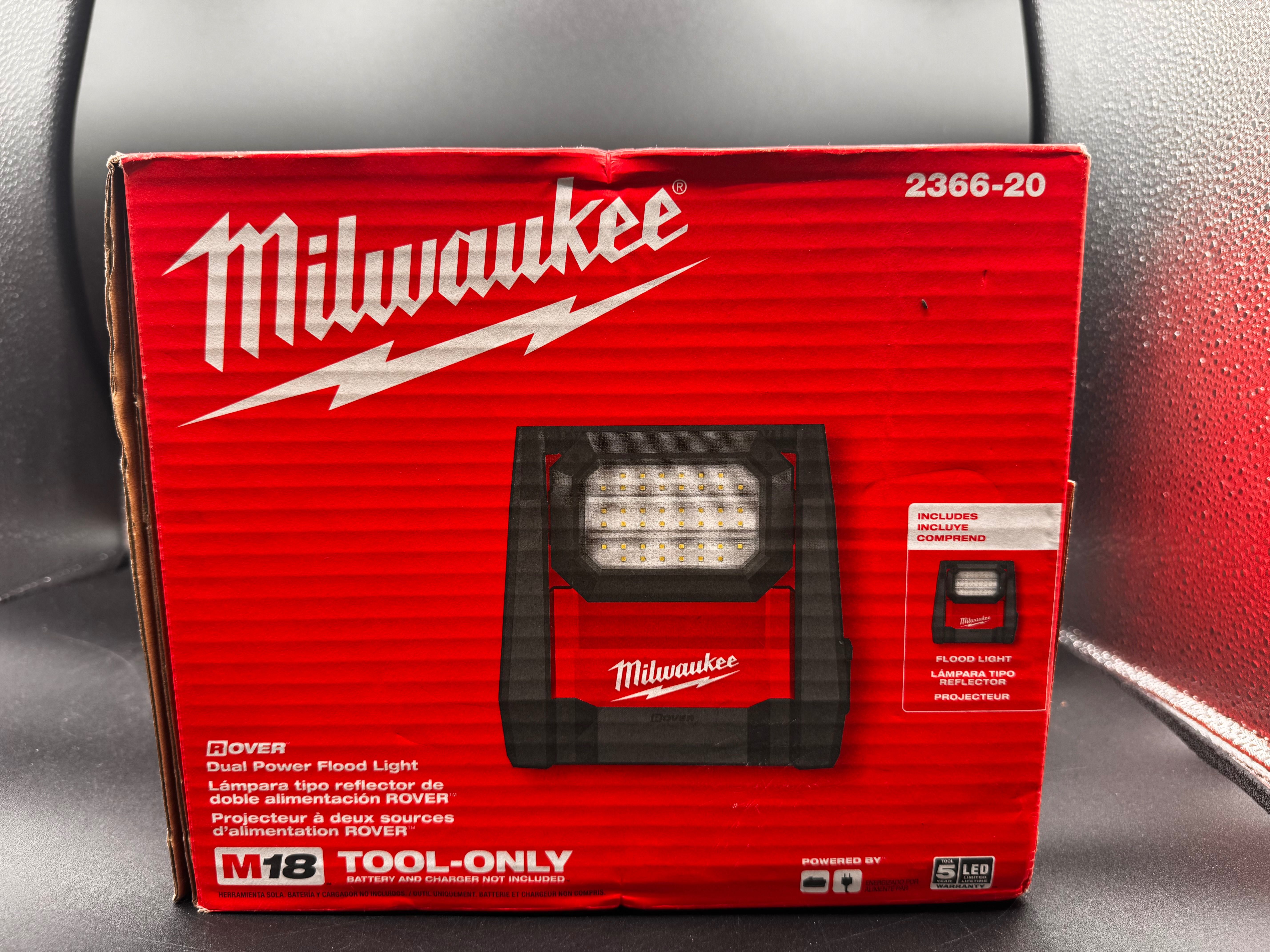 💡 Milwaukee 2366-20 M18 ROVER Dual Power Flood Light – Tool Only Selling a Milwaukee 2366-20 M18 ROVER Flood Light – in excellent condition. This dual power flood light runs on M18 batteries or corded AC power, offering bright, flexible lighting for any workspace. 🔦 Key Features: Dual Power Source – Use with Milwaukee M18 batteries or plug it into a wall outlet 3,000 Lumens of TRUEVIEW™ High Definition Output – Bright, even light with accurate color representation Durable Build – Impact-resistant lens and rugged construction, built to handle tough jobsite conditions Adjustable Head – Rotates 240° for perfect light direction Integrated Keyholes – Easily mount to walls or other surfaces Compact & Portable – Carry handle for quick transport