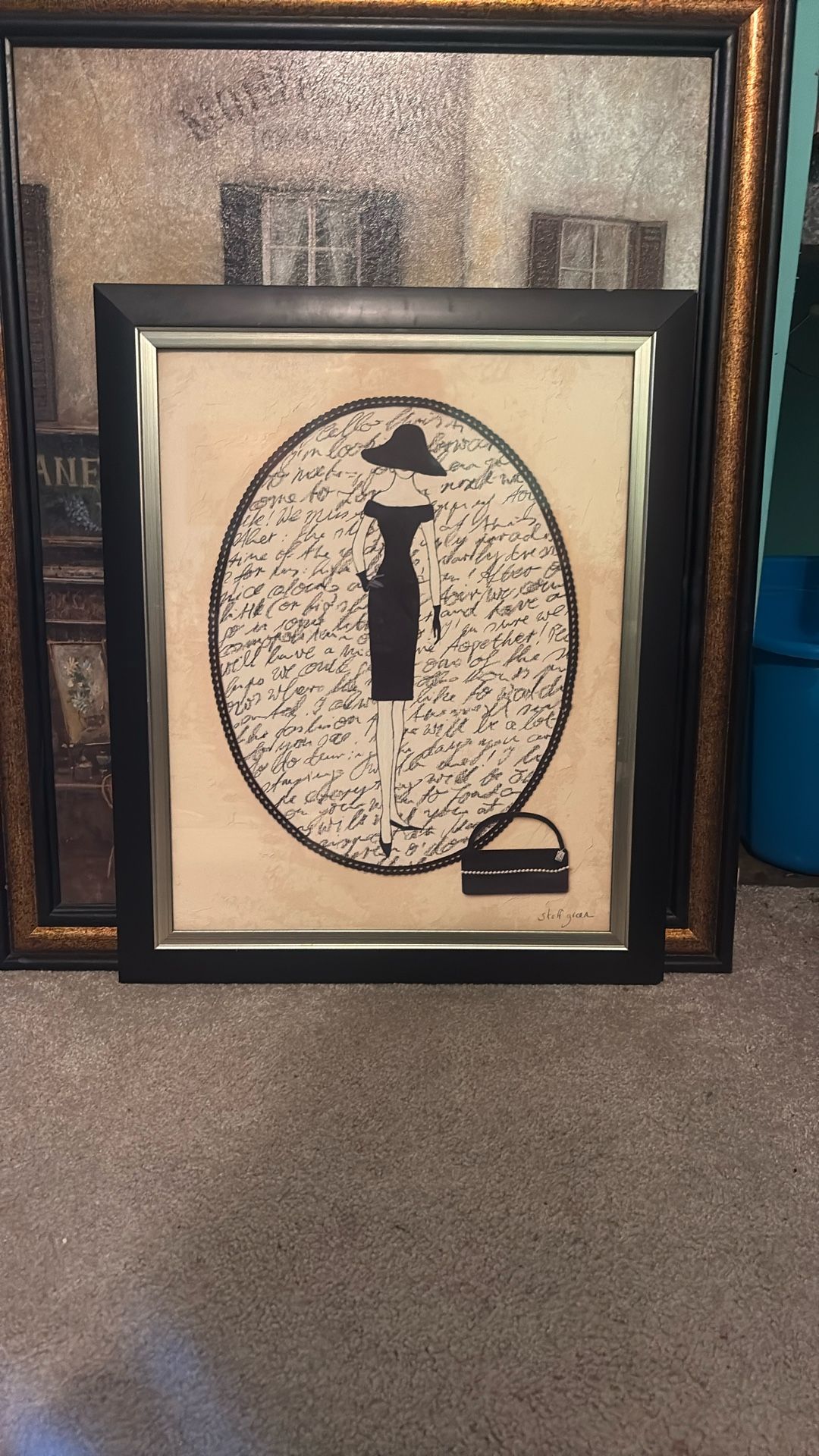 Framed vintage art signed by Steff Green - Piece is in very good condition - See images for condition and visual description details. Frame has scuff marks that can be touched up - No cracks or chips in glass. Measures approximately 23.5"Hx19.75"Wx.75"D