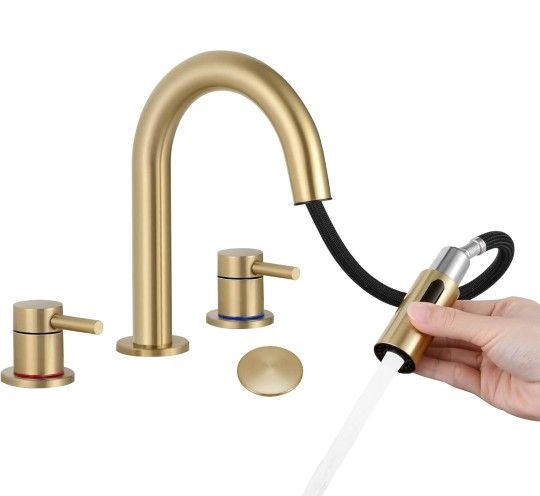 KZH Pull Out Bathroom Faucet for Sink 3 Hole 8 inch Spread Brushed Gold, Bathroom Sink Faucet with Pop Up Drain, Widespread Bathroom Faucet with Water