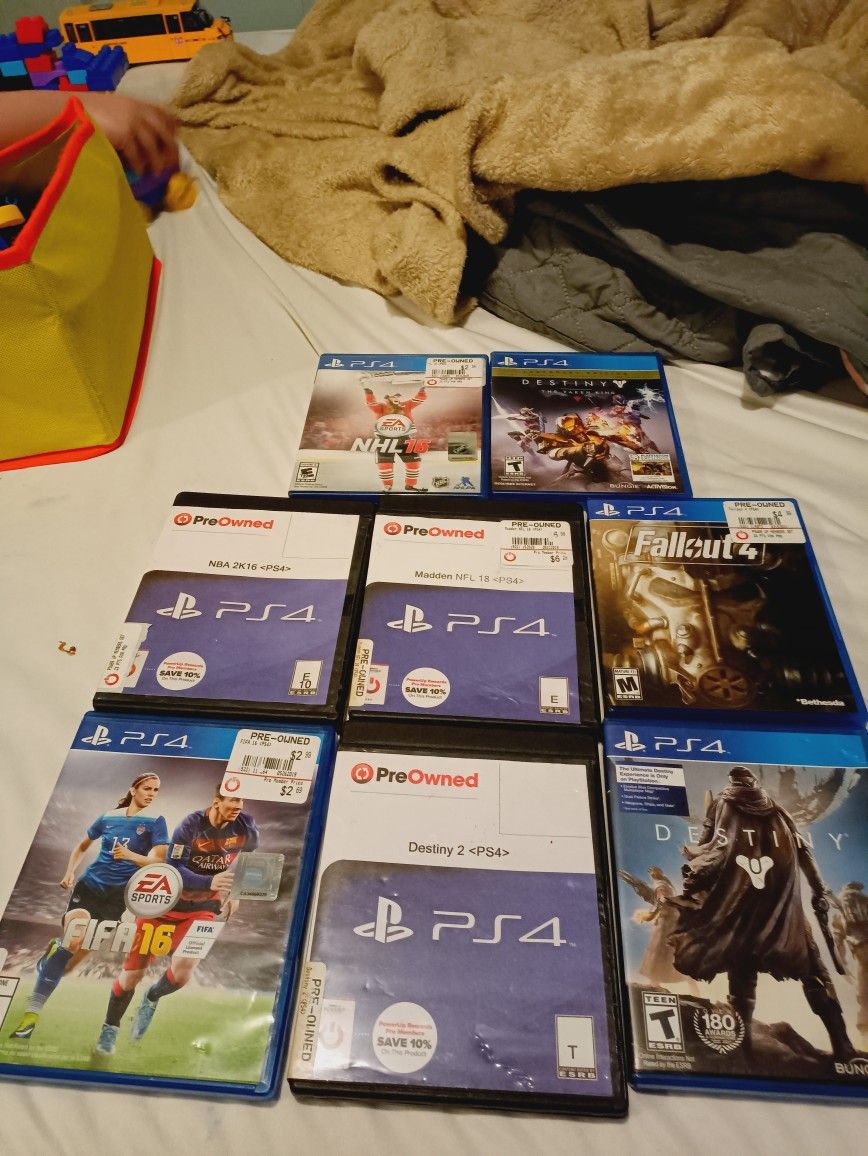 Nhl16, destiny the taken king, nba2k16, Madden 18, fallout 4, fifa16, destiny 2, and destiny, the price is $8 obo... Can send in just game sleeve envelopes and ship at $3.49, if okay with buyer still available 5/22/24