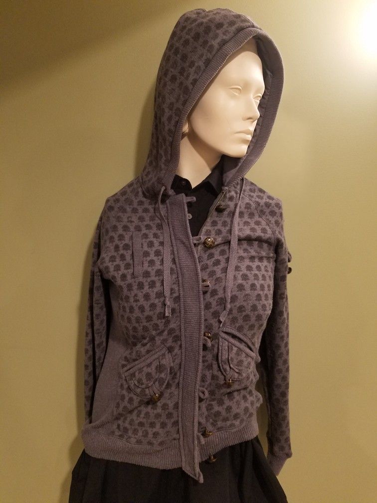Really neat grey with black print, jacket hoodie, retro kind of fashion with the fold over pocket enclosure, with zip up front complimented with hook loop buttons for show. Has hoodie with draw string, 4 total pockets, consisting of coin card pocket on sleeve and front chest area. Really warm and comfy with 80 % cotton. Beautiful buttons all over. In good condition! From smoke-free and pet-pet-free home Thank you for looking.