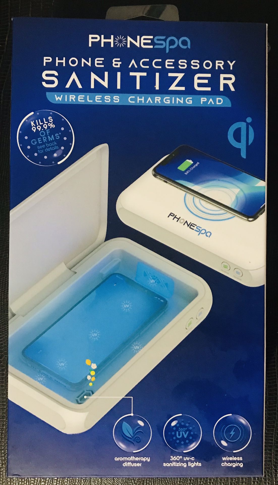 Phonespa Phone & Accessory Sanitizer: Portable, UV-C Sanitizer with Wireless Charger, Aromatherapy Diffuser, for sanitization of Smartphones, Watches, Earbuds, and More. Never used, brand new, in box. Original price $29.97