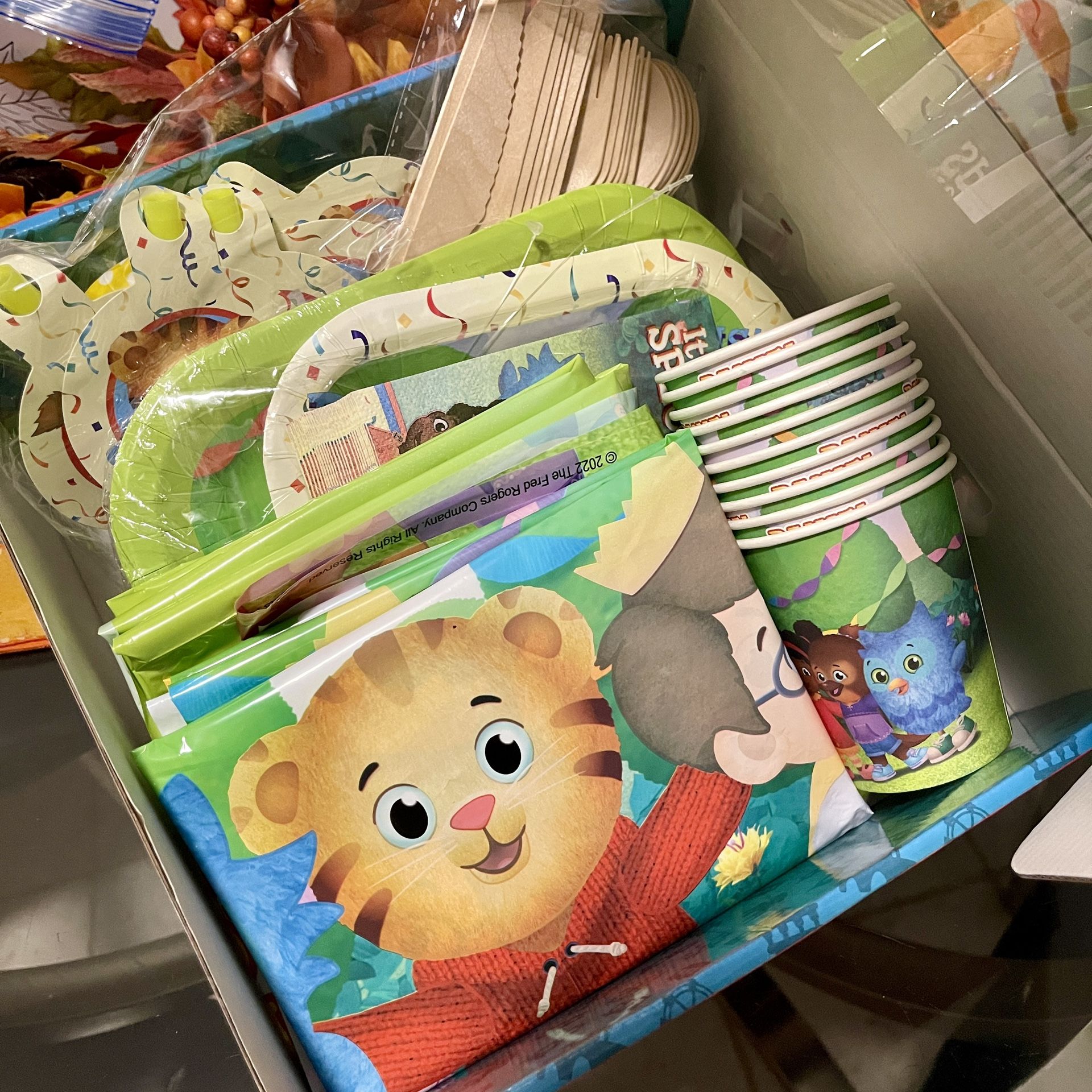 Daniel Tiger's Neighborhood Party-In-A-Box + 5x7 Banner Includes a separate vinyl 5x7 Daniel Tiger and Neighborhood Friends banner (see last pictures) Originally for 10 guests (10 Dinner plates, 10 Dessert plates, 10 cups, 10 party blowouts). ONLY used for a small gathering — missing 4 dessert plates, 4 dinner plates, and 4 party blowouts. Everything else is included and in great condition! ** OFFICIAL DANIEL TIGER’S NEIGHBORHOOD PARTY-IN-A-BOX - Get the party off to a great start with this Daniel Tiger’s Neighborhood Party-In-A-Box! Make it a special day with Daniel Tiger and friends. QUALITY PARTY DECORATIONS & SUPPLIES - Each Party-In-A-Box includes (1) 5 Foot Banner, (10) 7-inch Paper Dessert Plates, (10) 9-inch Paper Dinner Plates, (1) 8-foot Tablecloth, (30) Utensils, (10) 9-ounce Cups and (30) 5-inch Napkins and (10) Party Blow-outs EASY DECORATING - With this Daniel Tiger’s Neighborhood Party-In-A-Box, we’ve made it extra easy to decorate for your child’s party without taking hours. Includes everything you need to decorate and celebrate including tableware, decorations and accessories! DANIEL TIGER’S NEIGHBORHOOD PARTY THEME - Make your party stand out with this colorful and fun Daniel Tiger-themed party kit. Join Daniel and all his neighborhood friends to celebrate your next event! FOR ANY OCCASION - Daniel Tiger’s Neighborhood Party-In-A-Box is perfect for birthdays, holidays, graduations, and more! Quality-made paper products, easy-to-set-up decorations, wood cutlery and party accessories. $40