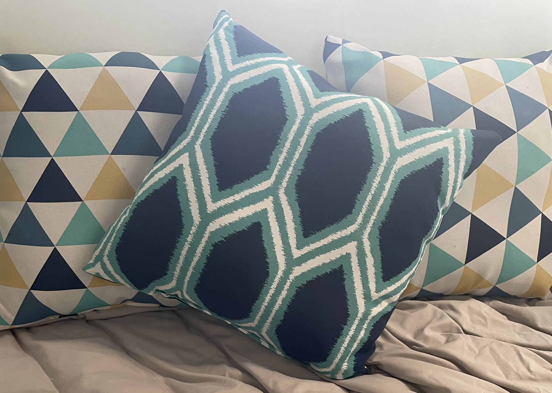 Set of three decorative pillows with geometric patterns. Sizes: 14"x14"x4".