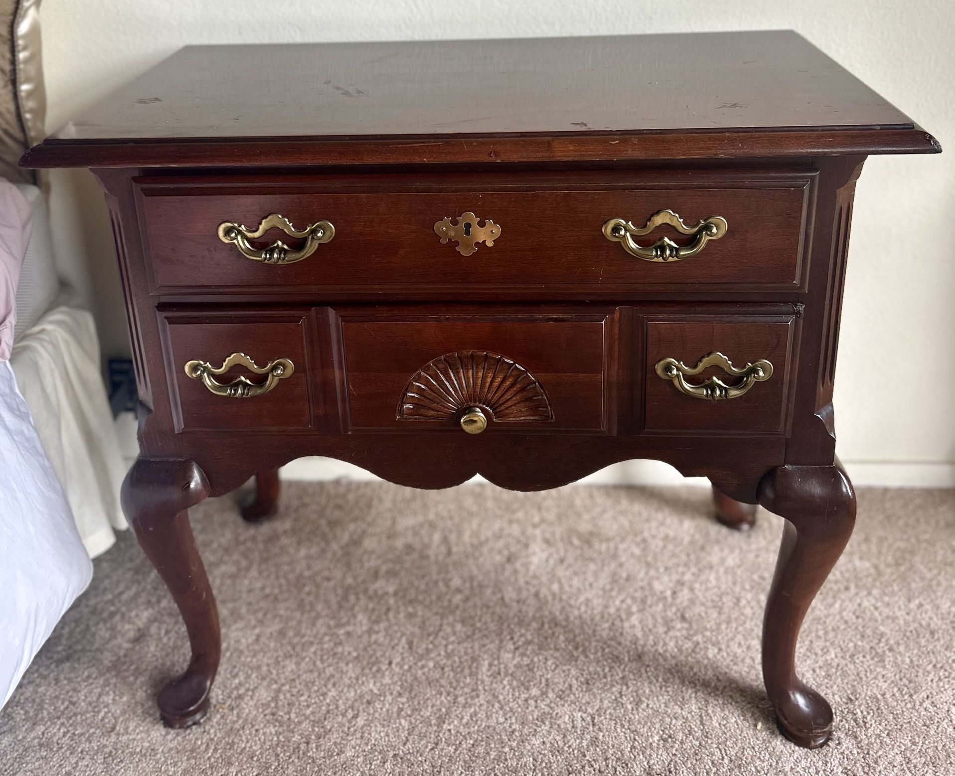 Wood table with good hardware 1 drawer Good condition overall but has some scratches, marks which is why price is low 30length 27 h 17 w