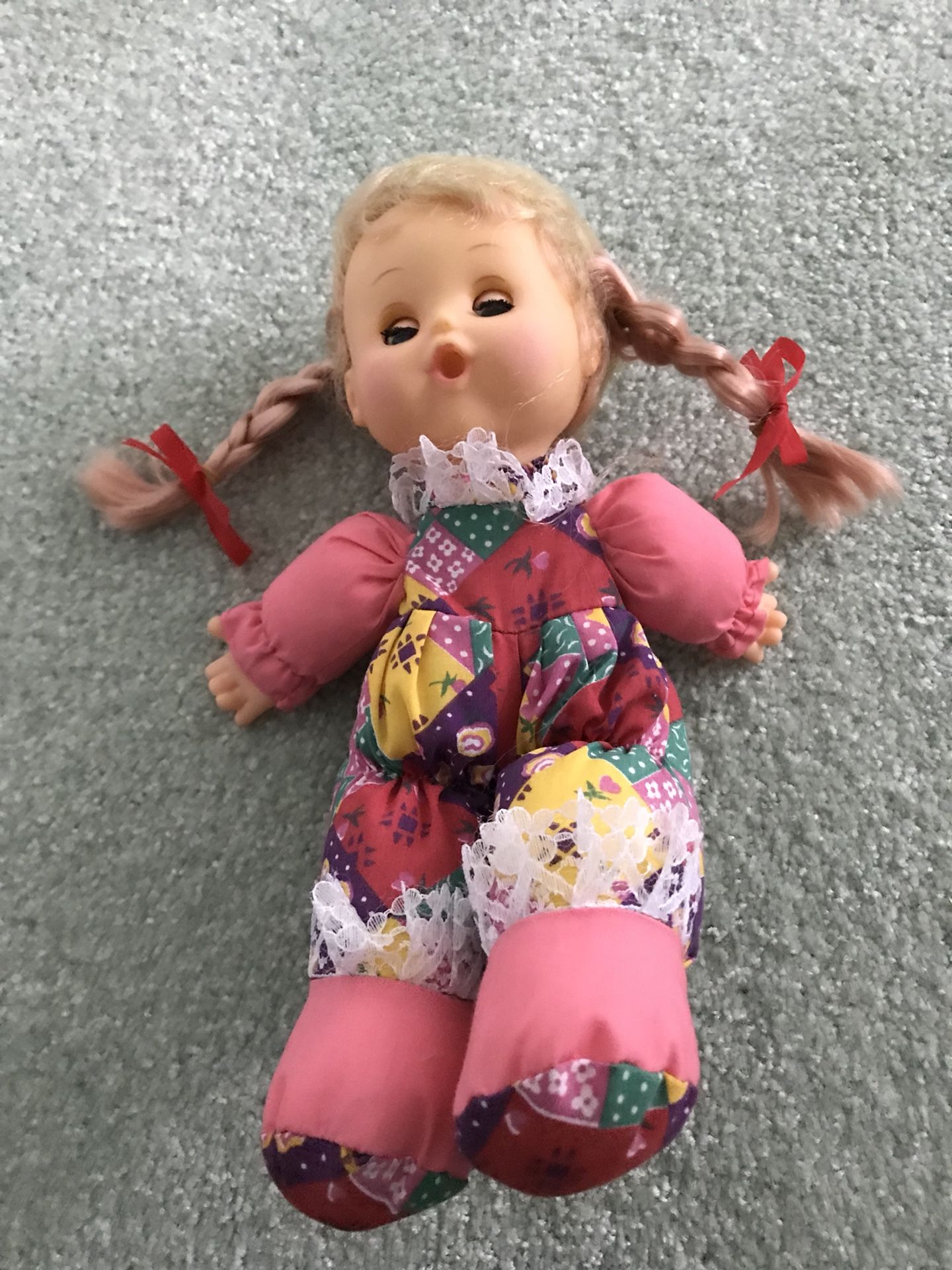 This is a 10 inch doll With eyes that open and close. It is dressed in a colorful outfit. The body is made of soft material and the head and hands are made of plastic/rubber. It is in excellent condition and comes from a smoke free home Hall third shelf