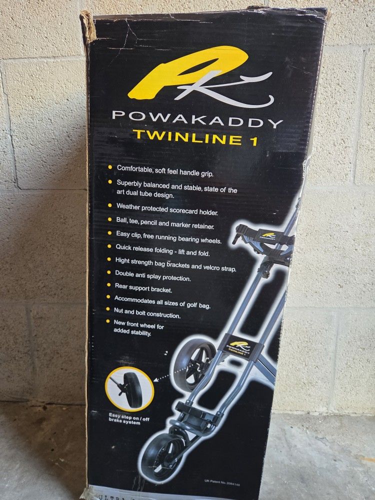 Powakaddy Twinline 1 Golf Push Trolley Brand new in the Box!It features an easy-to-use foot-operated brake. The cart has a waterproof scorecard holder with space for a ball, marker, tees, and a pencil. It is constructed from a lightweight aluminum frame and can be folded for easy storage. The design includes a "double anti-splay" feature and a new front wheel for improved stability.