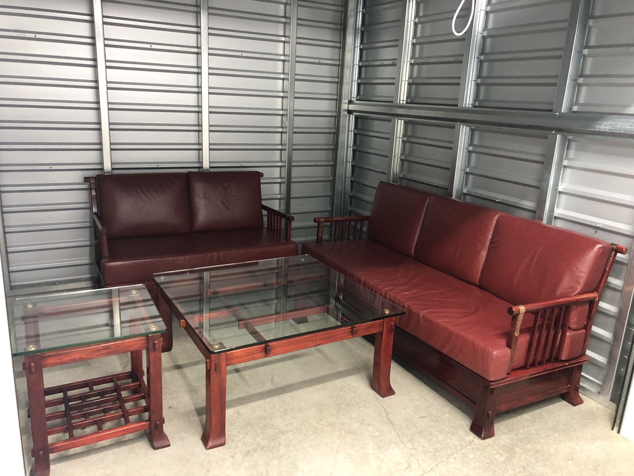 Vintage, rosewood living room set. Imported from China. Solid and heavy. Set includes couch, loveseat, side table, coffee table. Furniture is in very good condition. There are some fine scratches to leather seat of the sofa and some sun fading to frame but is hidden by the cushions.