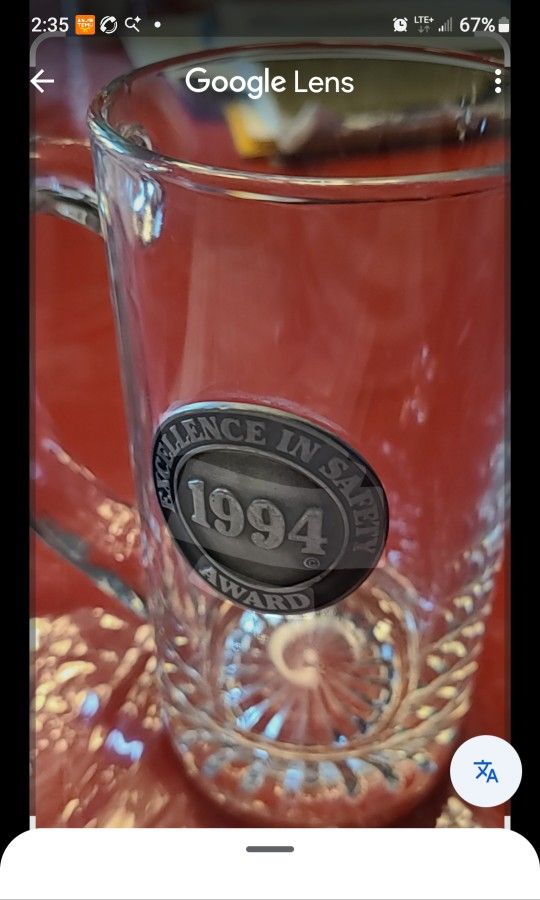 Glass beer mug with an attached inscribed medallion, with excellence in safety award 1994, it has a sturdy design with a thick base and handle typical of German beer mugs, the bottom portion of the glass features a decorative cut glass pattern.