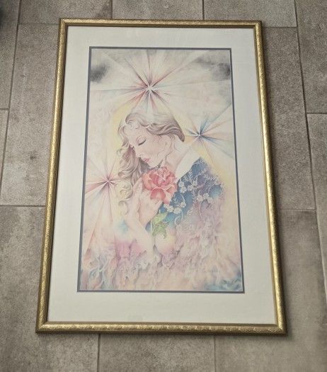 P. Solvesky Original Colored Pencil Framed Art Woman Stars Flower 38x26"