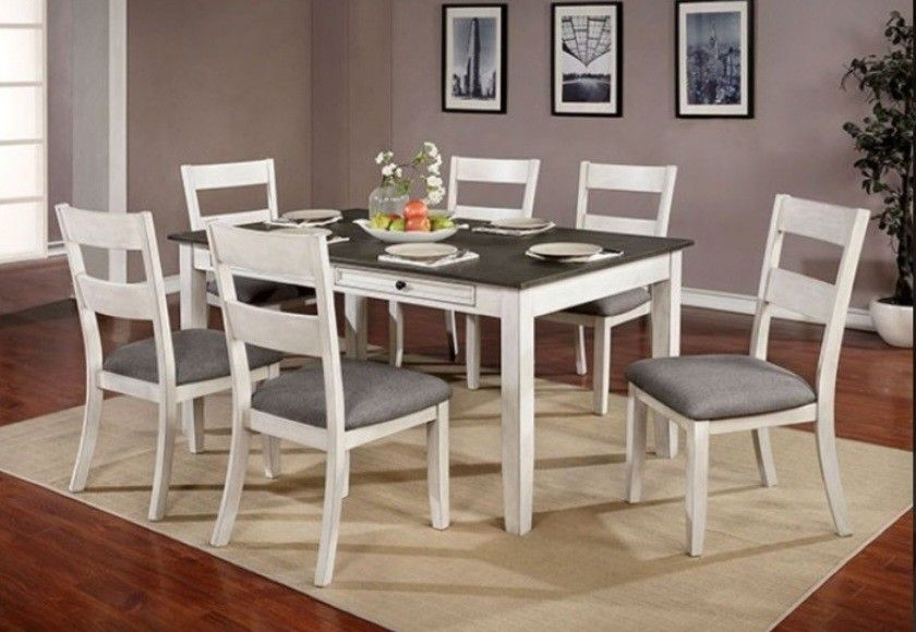 We are an online wholesaler and we deliver directly from the manufacturer to your home Delivery is only $40 Brand new in the boxes Assembly is an extra charge Mattresses are sold Separately We accept cash on delivery DINING TABLE | CM3715T CHAIR (2/CTN) CM3715SC This bright set from the Anadia Collection will brighten up any dining room. The unique two-tone design allows for eye-catching contrast, making this set the focal point of your space. The plank-style table top features natural wood patterns for a rustic touch. The ladder-back chairs feature padded and upholstered seats, ensuring inviting comfort for you and your guests. Rustic Antique White, Gray Linen-like Fabric, Solid Wood, Wood Veneer, Others Plank Style Table Top Two-tone Design Drawer w/ Round Black Knob Dining Table64"L X 38"W X 30"H