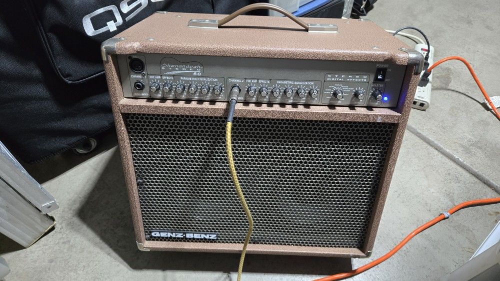 The Genz Benz Shenandoah Stereo 60 is a highly regarded, compact, 60-watt solid-state acoustic guitar amplifier known for delivering clear, warm, stereo sound for gigging musicians, featuring dual 6.5" speakers, two channels with independent EQs (including sweepable mids), phantom power for mics, built-in Alesis digital effects (reverbs, delays), and a monitor-style cabinet for flexible stage positioning, offering a professional, natural tone perfect for singer-songwriters and small gigs. Key Features: Power & Speakers: 60 Watts (30W per side in stereo) driving dual 6.5-inch woofers with tweeters for full-range sound. Channels: Two channels, each with 3-band EQ, effects level, and sweepable mids for precise tone shaping. Inputs: Channel 1 accepts XLR (with phantom power) & 1/4" instrument; Channel 2 takes 1/4". Effects: Integrated Alesis stereo digital effects processor with 16 presets (reverbs, delays, etc.). Outputs: Left & Right XLR Direct Outs, Headphone Jack, Effects Loop. Design: Compact, lightweight (around 29 lbs), with a stage monitor shape for tilting back, reducing boominess.