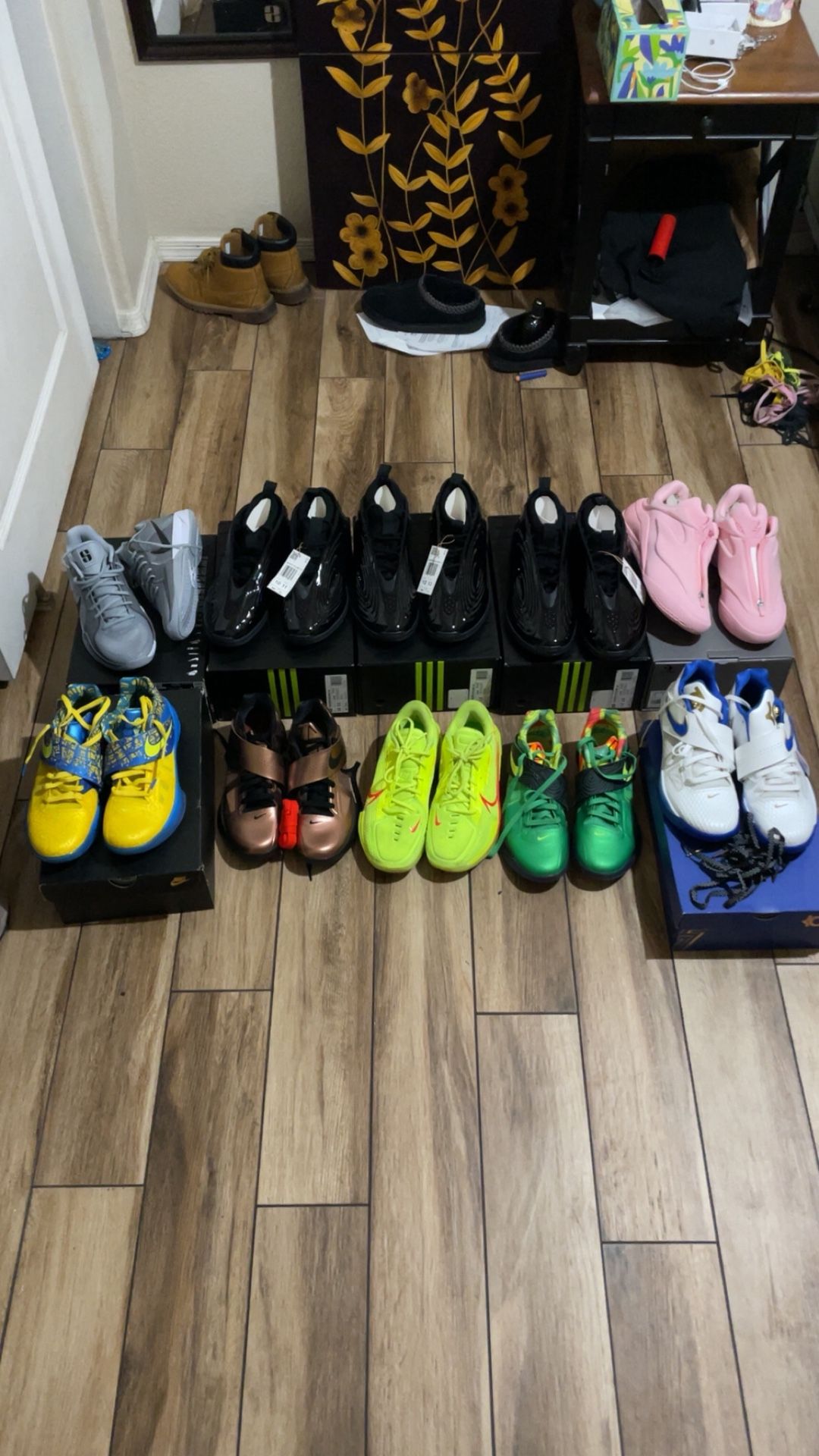 Message me for prices All of the top row shoes are brand new with box and never tried on. then bottom row are lightly used once amazing condition Sabrina 2 TB “Wolf Grey” Size 9M no lid for box Harden Vol 10 “Hellcat” Size 12 x2 Harden Vol 10 “Hellcat” Size 10 Shai 001 “Blush” Size 10 GT Cut 1 “EYBL Volt” Size 10.5 KD 4 “MVP” Size 10.5 KD 4 “Scoring Title” Size 10.5 KD 4 “Christmas” SOLD KD 4 “Weatherman” Size 10.5