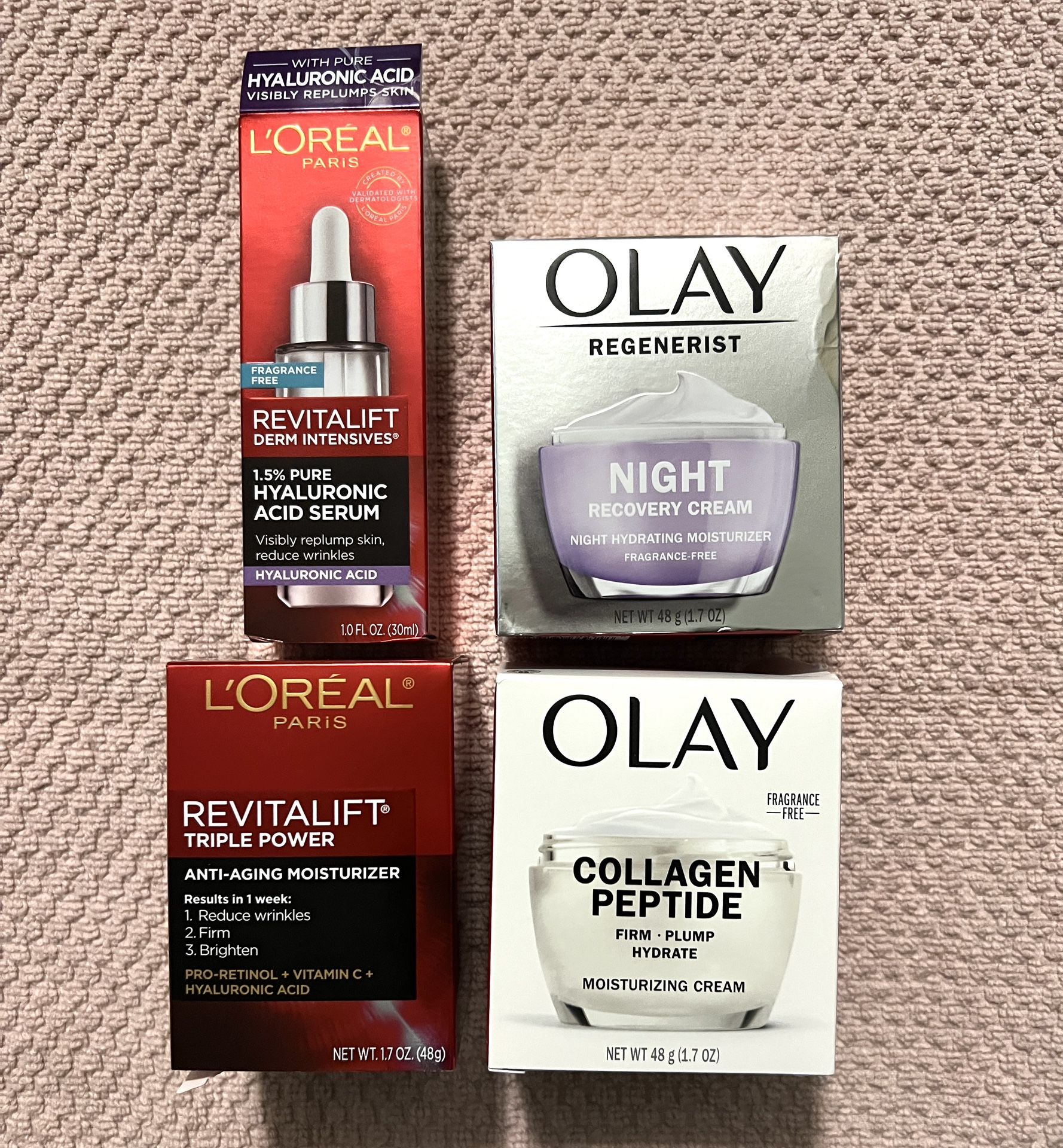 $115 Retail Value! Bundle includes Collagen Peptide cream, Night Recovery Cream, Anti- aging Moisturizer, and Hyaluronic Acid Serum. Our skin deserves plumping moisture, so give it OLAY Regenerist Collagen Peptide 24. We're giving you transformative Collagen Peptide in this powerful and fragrance-free face moisturizer. This lightweight formula absorbs quickly, giving you 24 hours of hydration without a sticky, greasy or heavy feeling. It's specifically formulated with tried-and-true ingredients, like Collagen Peptide and Vitamin B3+, to transform the look of your skin. And the longer you use this face moisturizer, the better your skin will look and feel. On day 1, your skin's texture will look smooth. With two weeks of use, your skin will look and feel visibly firmer, and your fine lines and wrinkles will be less noticeable. And are you ready for more? This powerful cream is proven to hydrate better than the $400 cream. To use, just smooth on morning and night for visibly firm skin.