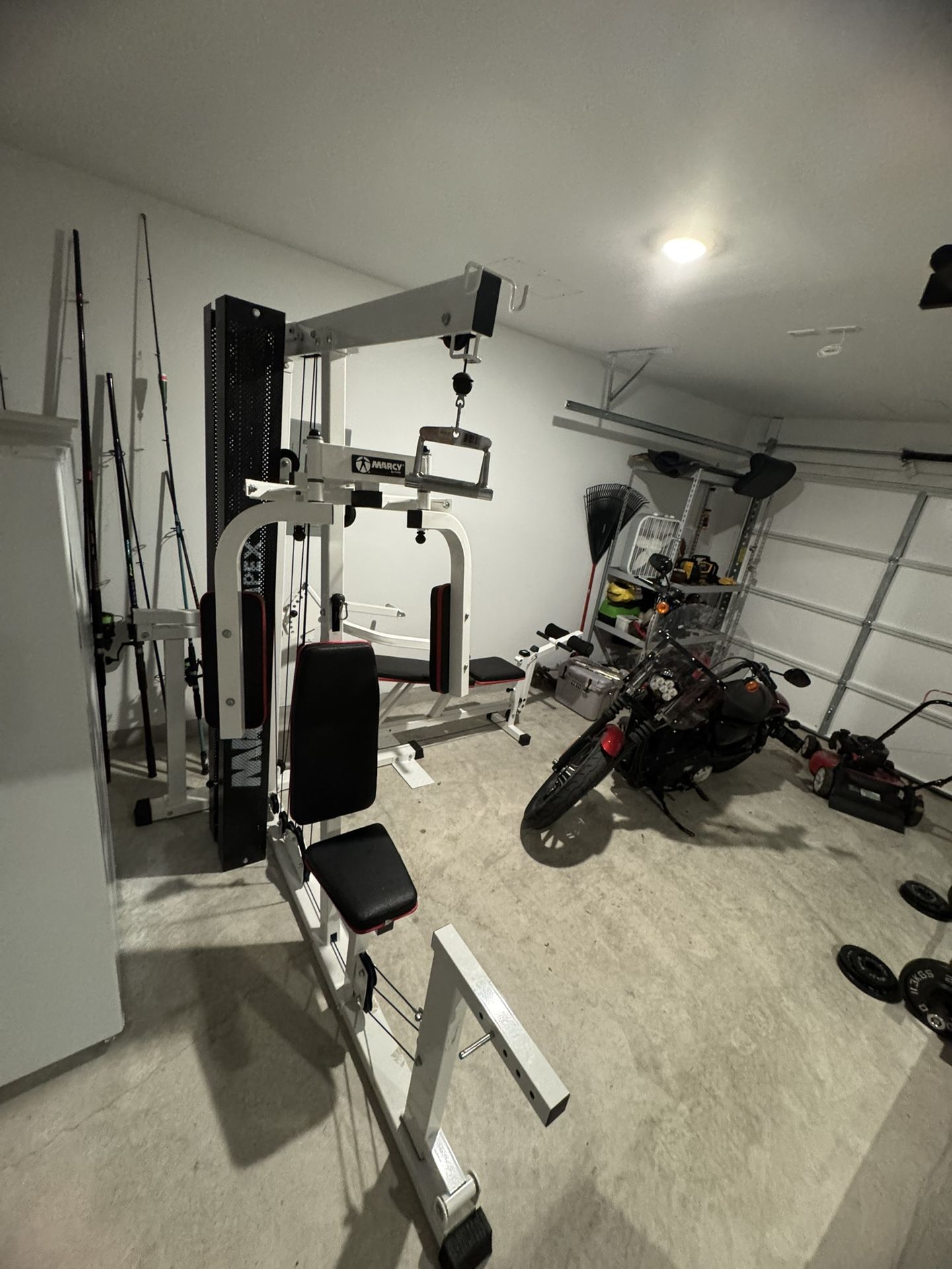 Marcy weight set in excellent condition. Hardly used. Everything works perfectly. I have straight pull down bar, rope pull down , etc.