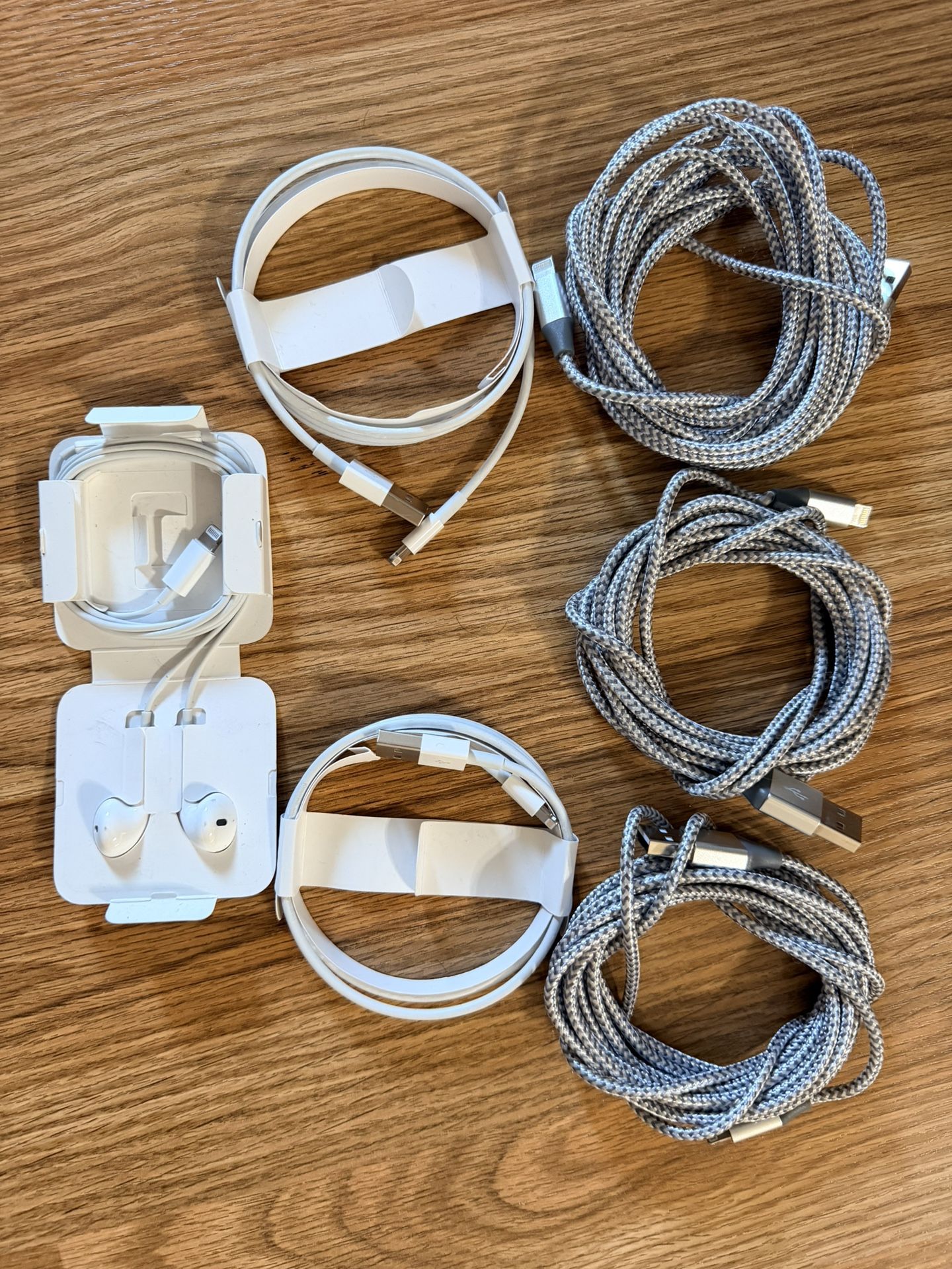 Brand new headphones & 2 original Apple cables 3 Lightly used 6ft charging cables