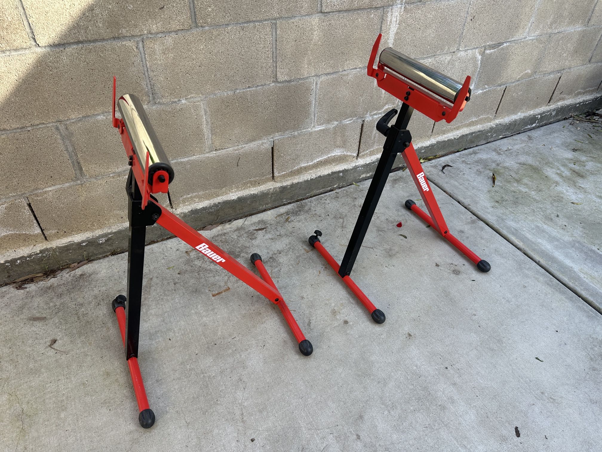 No missing parts, only used for 1 project. $40 for both stands. BAUER 250 lb. Capacity Adjustable Roller Stand with Edge Guide