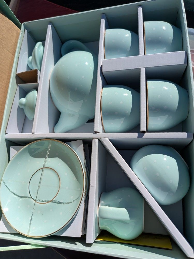 Jewelkeeper 13 piece porcelain tea set Brand new condition, only opened one to take pictures but you will get one still sealed in the box Built in carry handle on the box Individual compartments to store everything Amazon price $45 selling each set for $30