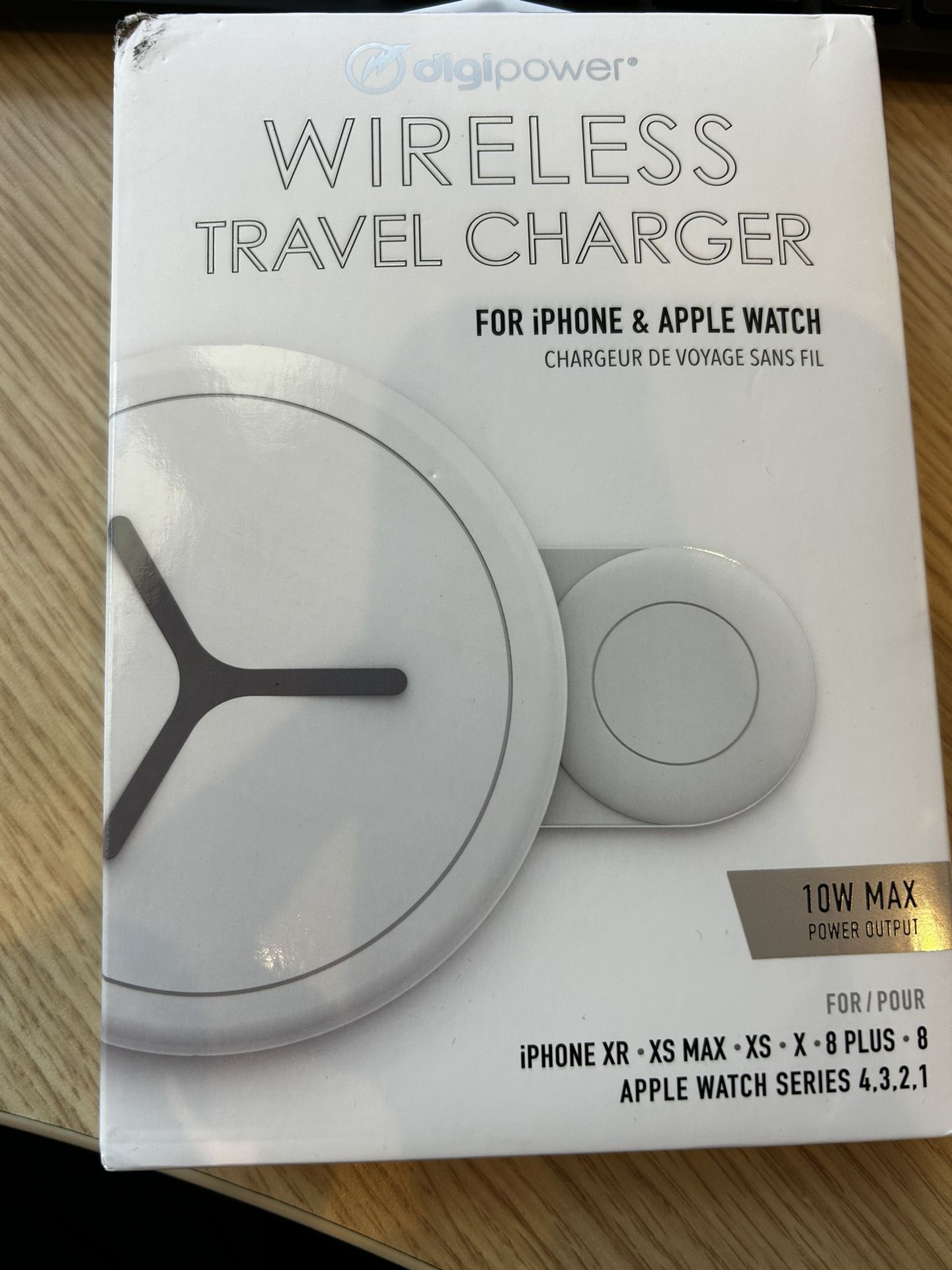 Brand new wireless travel charger for iPhone and Apple Watch. Compatible with iPhone XR, XS Max, X, 8 plus, 8. Apple Watch series: 1-4.