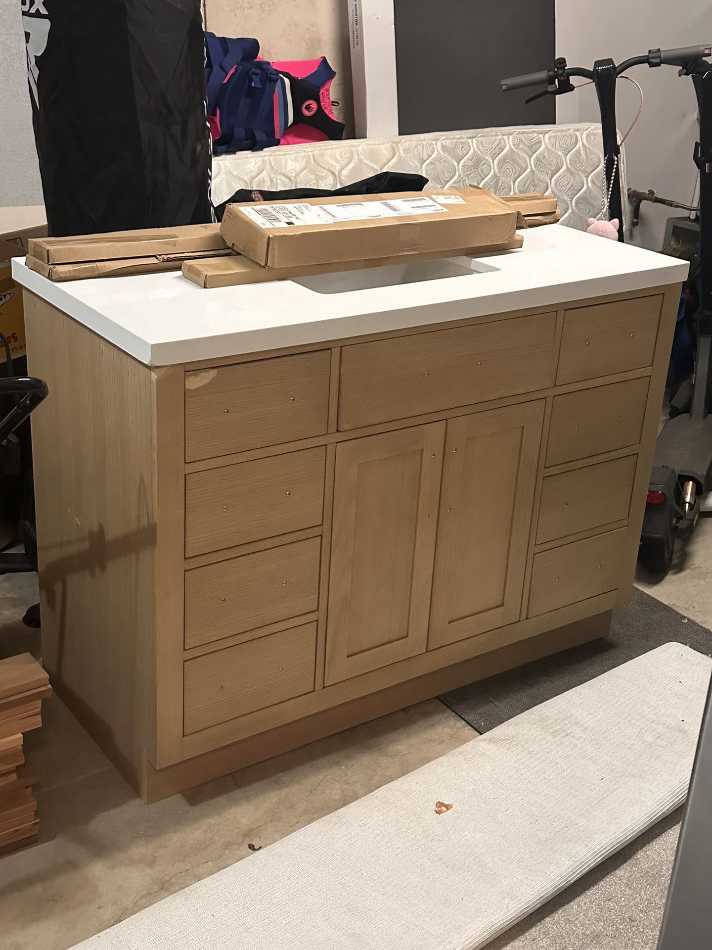 ARIEL 55” Bathroom Vanity – White Oak Brand new vanity, just arrived but has a small defect. Made of solid American oak wood with a 1.5” pure white quartz countertop and backsplash. Features 2 soft-closing doors and 9 full-extension dovetail drawers with matte black handles. Stylish and modern design — perfect for a bathroom remodel.