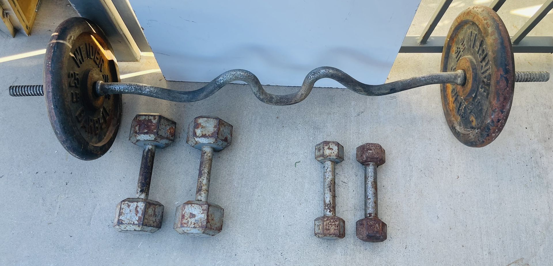 50lb in total in the bar, (25lb each disk), the medium 15ea, the smallest 5ea