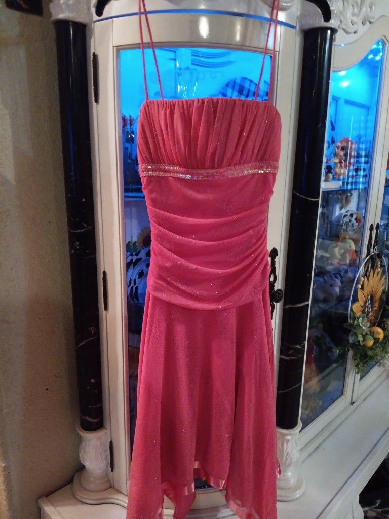 Beautiful Salmon pink color dress with specs of glitter throughout dress also sequence stones under bust line. The bottom has satin ribbon and is in v form. The dress is a size M. A Stunning dress for a nice occasion.