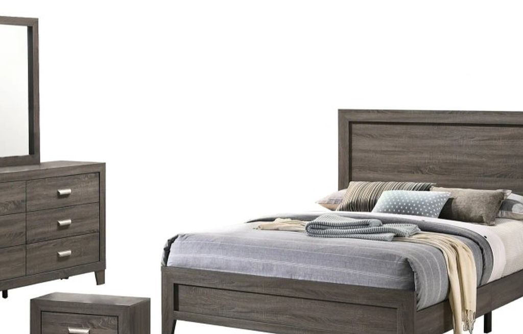 NEW IN THE BOX ASSEMBLY REQUIRED LIGHT BROWN FINISH MATTRESS NOT INCLUDED Include: Bed; 2 Nightstands; Dresser; Dresser Mirror. The clearance from floor to underside of bed is 4″. The bed is compatible with an adjustable base. Bed’s dimension is 62″L x 51.2″W x 85.2″H. This is a platform bed, so you will not need a boxspring. Bed style | Panel Bed (needs box spring) Bed Size | Queen Natural Wood Grain Color Variation All Tools Included Does not come with a mattress.