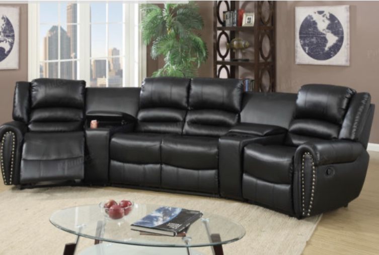 Motion Home Theater Item # F6747 Color: Black Also Available in Brown Materials: Bonded leather Plywood Mechanism+ Plastic Leg Foam, Fiber Battings Some Assembly Required Dimensions: 138″ x 38″
