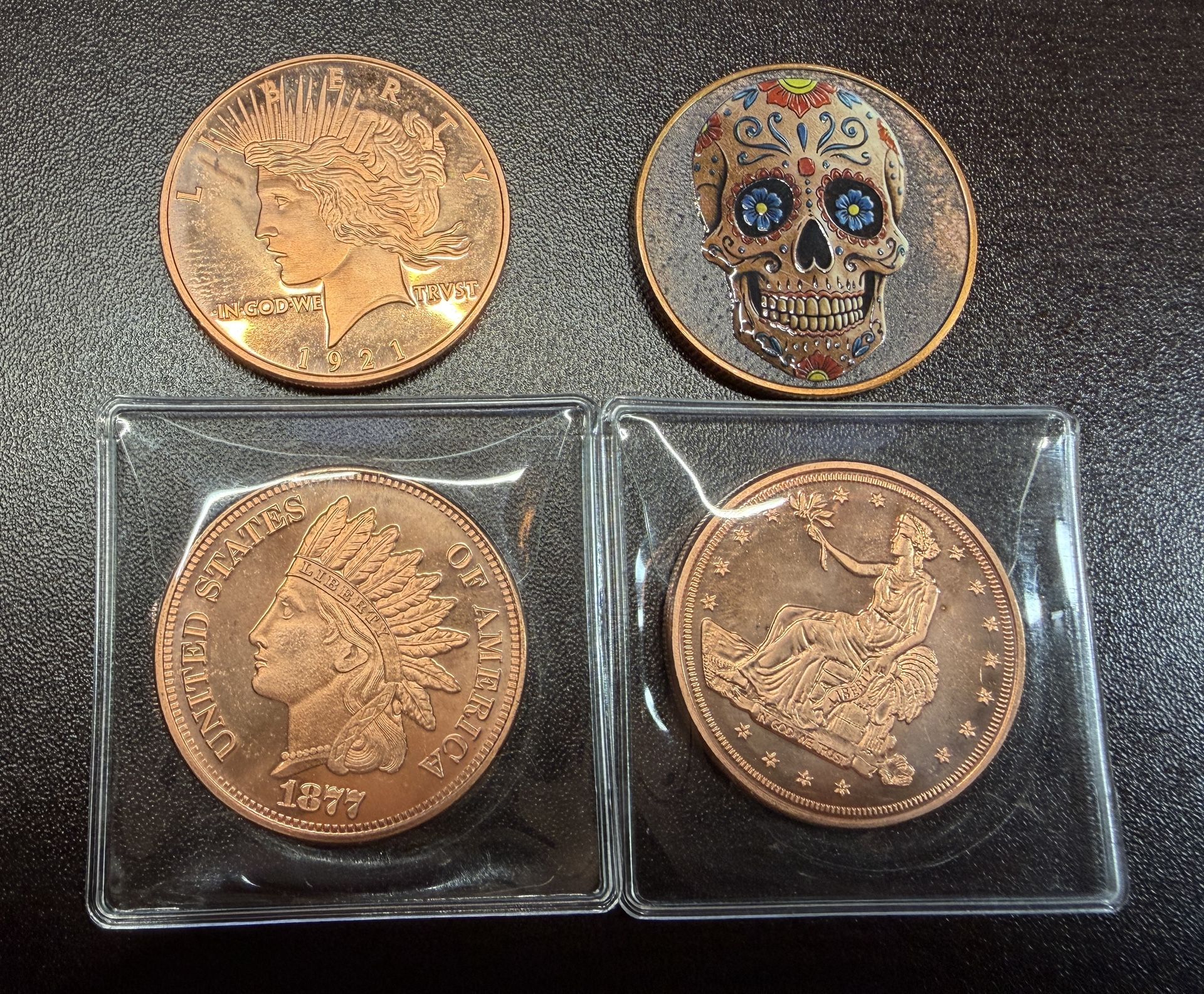 Up for sale is a mixed lot of four (4) large copper rounds/medallions, all in protective flips. Beautiful detailed designs, great for collectors, preppers, or anyone who likes unique copper pieces. Includes: • 1921 “Liberty” style copper round • Artistic sugar skull / calavera copper round • 1877 Indian Head style copper round • Seated Liberty style copper round “One AVDP Ounce” copper round (.999 fine copper) All pieces are in nice condition with sharp details and attractive copper luster. Perfect for display, stacking, or adding to a collection. 💰 Asking: $25 for all 4 📍 Local pickup in Phoenix area 🚫 No shipping 💬 Serious inquiries only Message me if interested! Silver, bullion, gold, coins, collectibles, copper rounds, copper bullion, .999 copper, copper ounce, copper medallions, coin lot, collector coins, Indian Head style, Seated Liberty style, American eagle copper, sugar skull copper, art rounds, commemorative rounds, numismatics