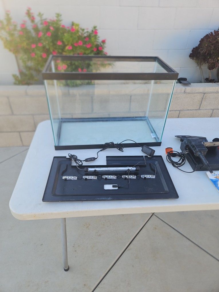 Used 20 gallon Fish tank (24in W x 12in D x 16in H). Comes with Aqueon filter, air pump, small thermometer, 4pc ball air stones, two nets, and assorted care products. Everything works. - $35