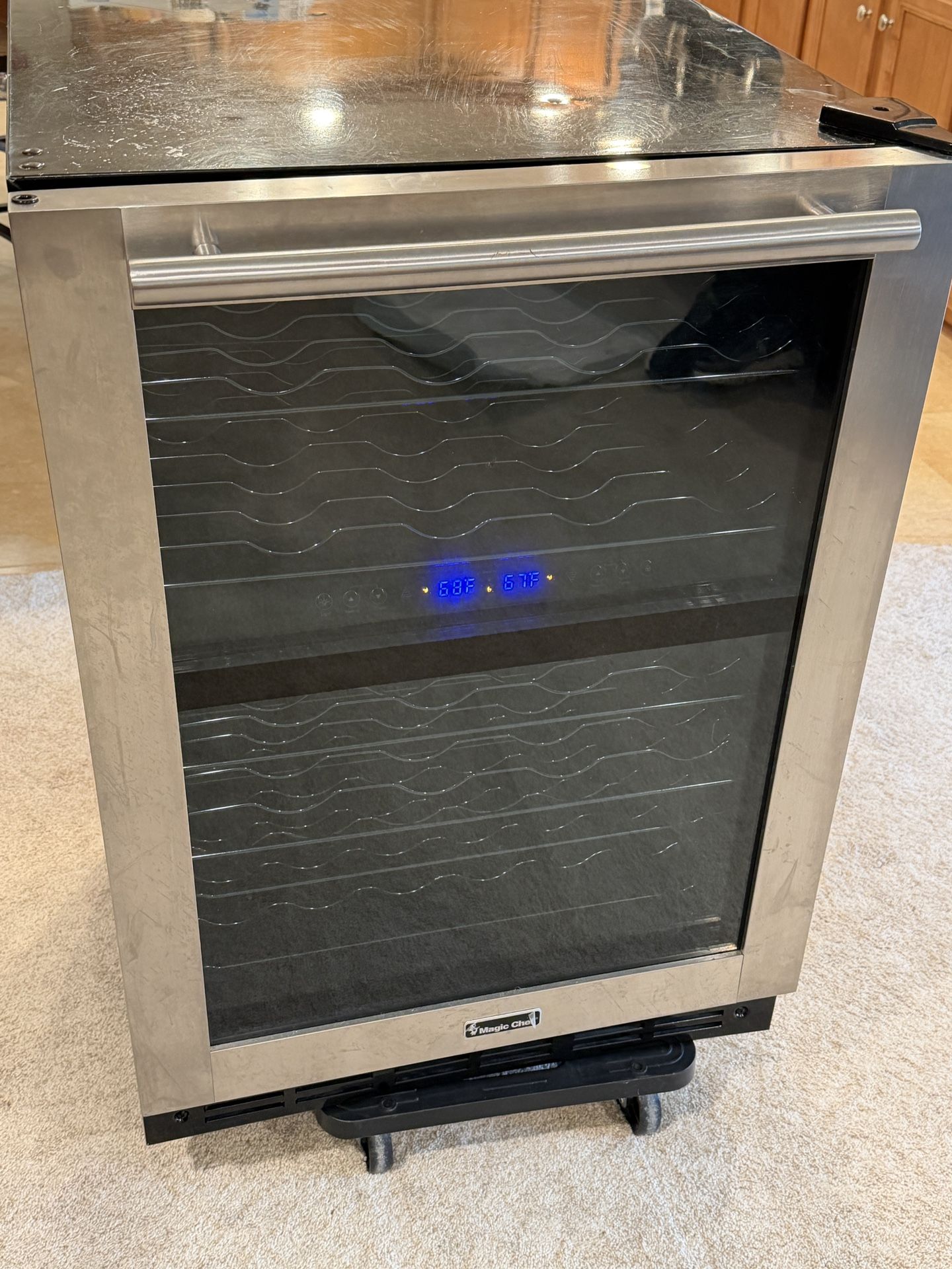 Magic Chef 44 bottle, dual zone, wine fridge. Works great, we just upgraded to a larger fridge Blue internal light works great. Bought this at Home Depot and has been working great.