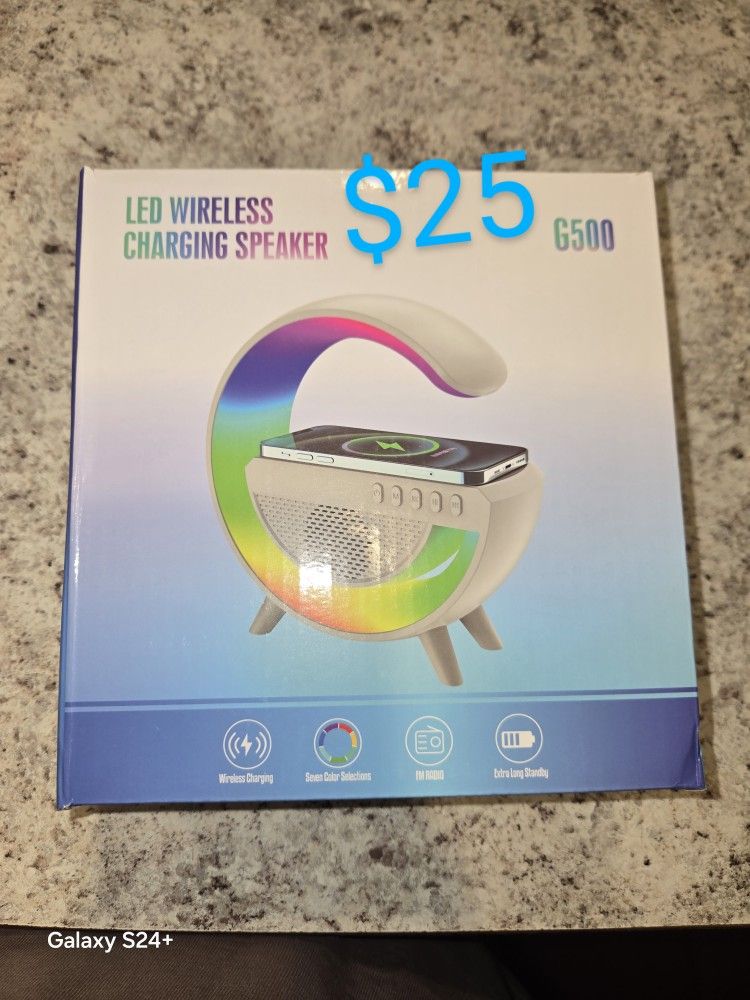 Features: -Bluetooth speaker: Enjoy high-quality audio with the built-in Bluetooth speaker. -Wireless charging: Charge Qi-enabled devices by placing them on the charging pad. -LED light: Set the mood with customizable -LED lighting effects that can sync to the music. -FM Radio: Listen to your favorite radio stations. -Long battery life: Enjoy extended playback time on a single charge.