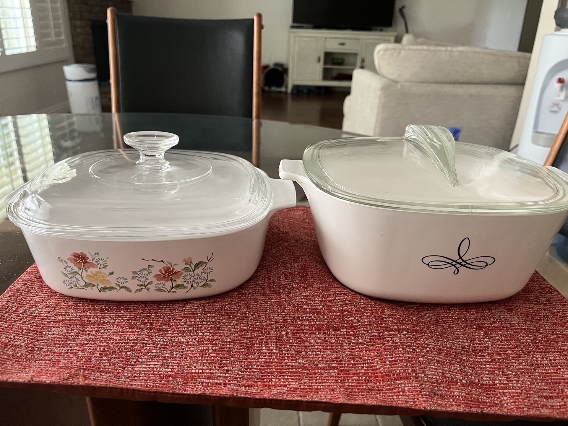 Corning ware with glass lid handle lids One measure: 8.5 width x 8.5 depth 4” height One measure:: 8.5 width x 8.5 depth 2.5” height Both all in excellent condition, hardly used. Both for $15.00