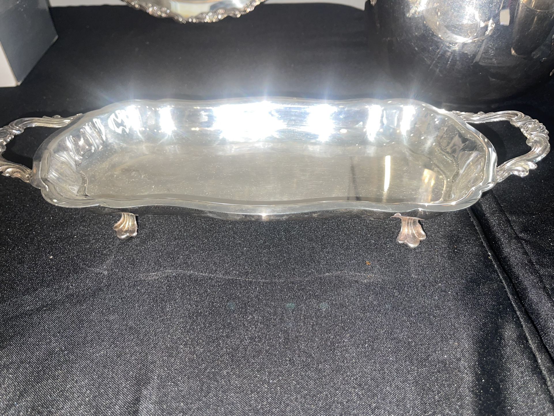 Elegant vintage silver-plated serving tray by the respected J.B. Rogers Silver Company, featuring graceful scroll handles, a softly scalloped rim, and raised feet for a refined presentation. This beautifully proportioned tray reflects the golden age of American entertaining—perfect for serving pastries, tea sandwiches, or cocktails, or styled as a vanity, bar, or coffee-table accent. The original manufacturer’s label remains intact, adding charm and authenticity. Details: • Silver-plated (not sterling) • Raised footed base with four feet • Ornate side handles • Original paper label present • Made in Taunton, MA, USA • Measures apprx 14” long and 5.5” wide Condition: Gently aged with light surface wear and patina consistent with vintage silver. No dents or structural issues. Displays beautifully. One of many cherished items I inherited from my mother’s silver collection.. Every item means a lot to me — an abundance of fond memories of her hosting fabulous parties . Unfortunately I have to start selling them as I work through a very financially challenging time …So I’m hoping it finds a good home with someone who will appreciate it 🥰 (I’ve included a picture of all of the items in my mom’s silver collection that are also listed for sale) Asking $95 obo