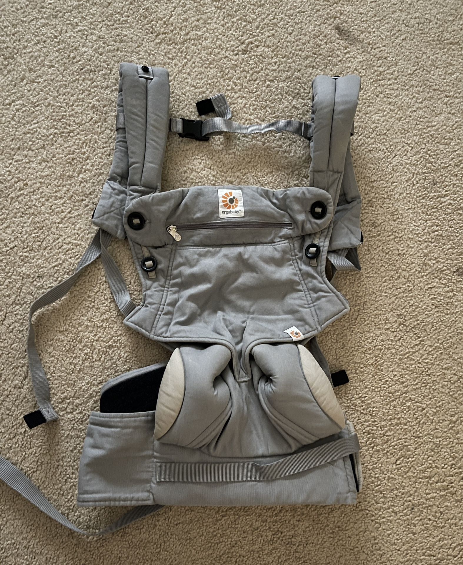 Great condition and comes with a seat cushion for infant. Pearl gray. Grows from newborn to toddler (0-48 months; 7-45lbs) • All carry positions including front outward facing • Soft, 100% premium cotton fabric • Includes large removable pouch and lumbar support for extra comfort This versatile carrier provides four convenient carry positions (inward, forward, hip & back) Large button adjusters allow you to switch baby from inward to forward mode easily. With padded lumbar support and extra-cushioned crossable shoulder straps, the Omni 360 gives you and your baby amazing all day comfort. Includes detachable storage pocket as well as a UPF baby hood for sun protection, privacy and easy breastfeeding.