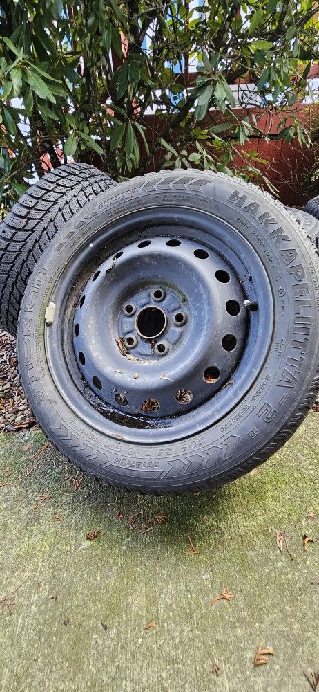 16" steel wheels. I used them on a 2008 Scion XB, but they will fit a number of vehicles. Note: Studded tires are mounted on the wheels, but I chose to stop using them due to their age. I recommend doing your due diligence and having the tires inspected in advance and by a professional, if you choose to use them.