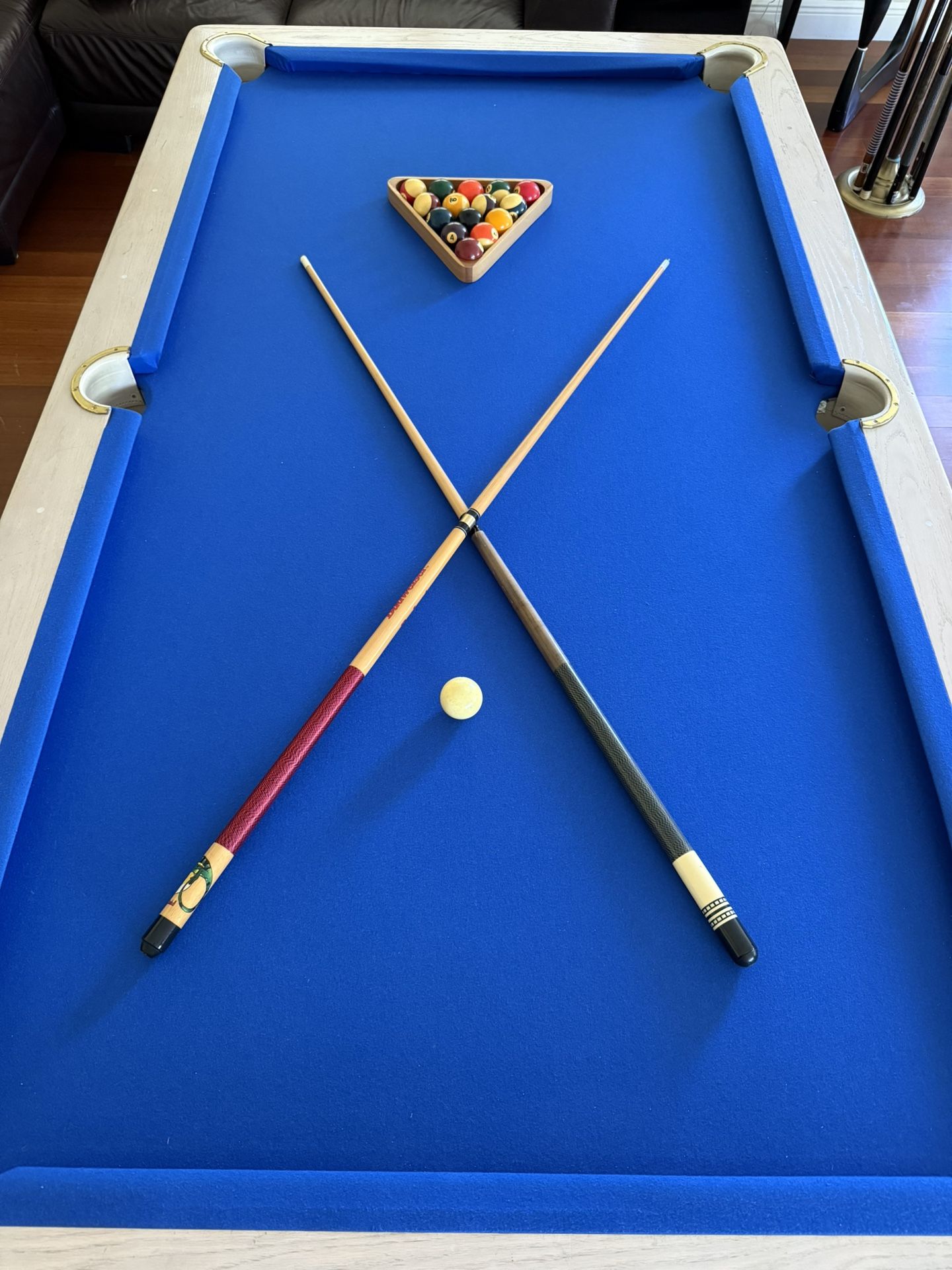 I got this table used 2 years ago and put a brand new felt on it amazing table need to get rid of it because I just don’t use it anymore honestly Ana amazing table perfect for anyone’s house has blue felt with beige hardware and gold accent pockets, if you wnat this table you will need to have someone arrange to disassemble and pick it up and drop it to your place. If you add delivery fee we will happily do it for you