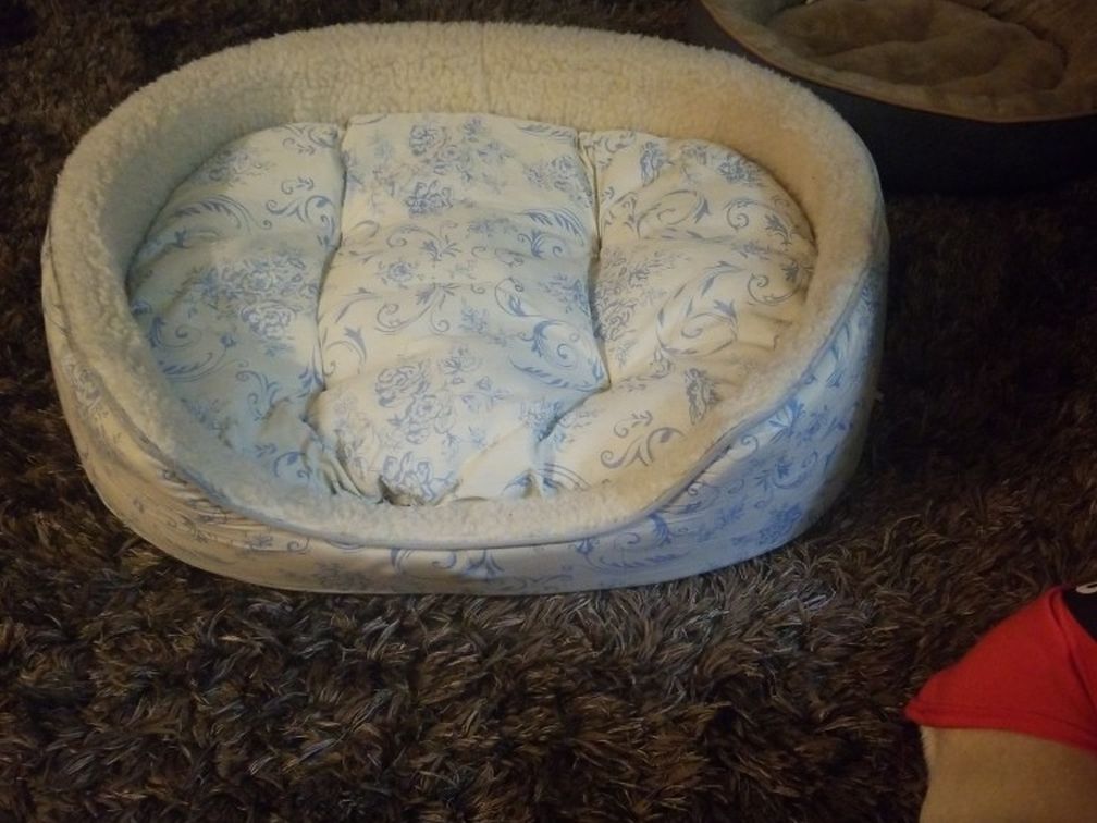 Blue and white very cozy and comfortable. My dog won't use come get.