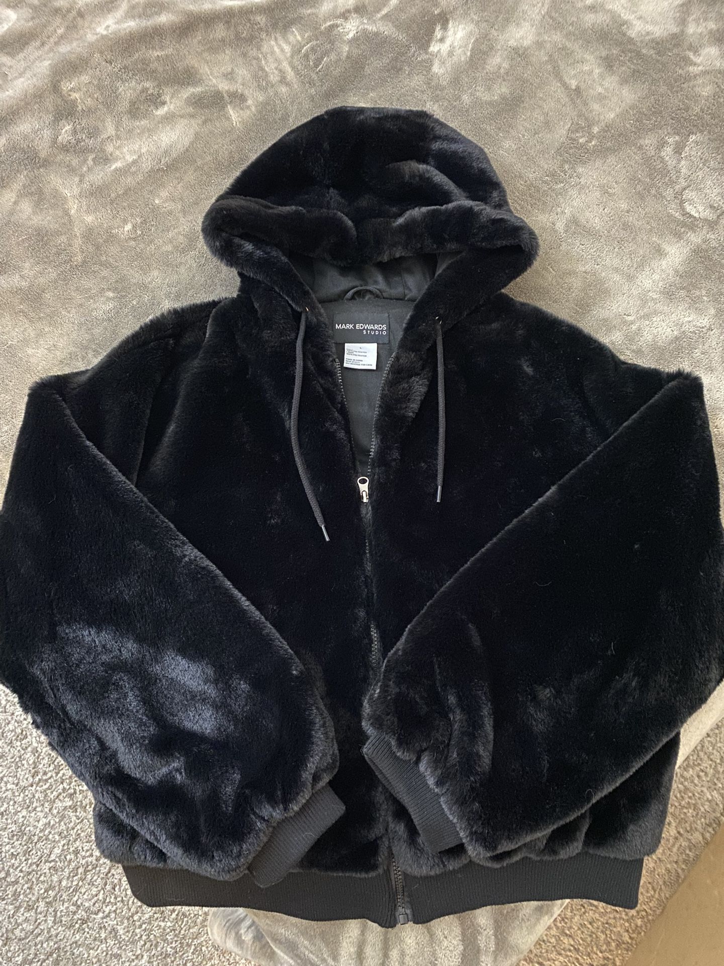 Cozy black faux fur hoodie by Mark Edwards. Basically new without tags…inner lining is cloth like fabric. Has pockets and zips up. Size Large….I think from junior section but not positive.