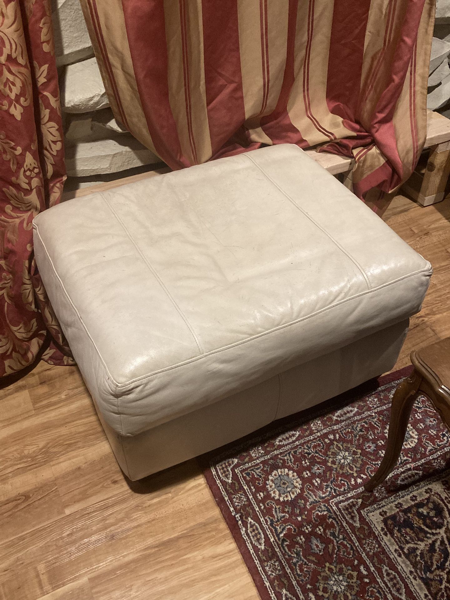 A tan, leather ottoman. No rips/tears. Minor smudges. 24x30x16 inches