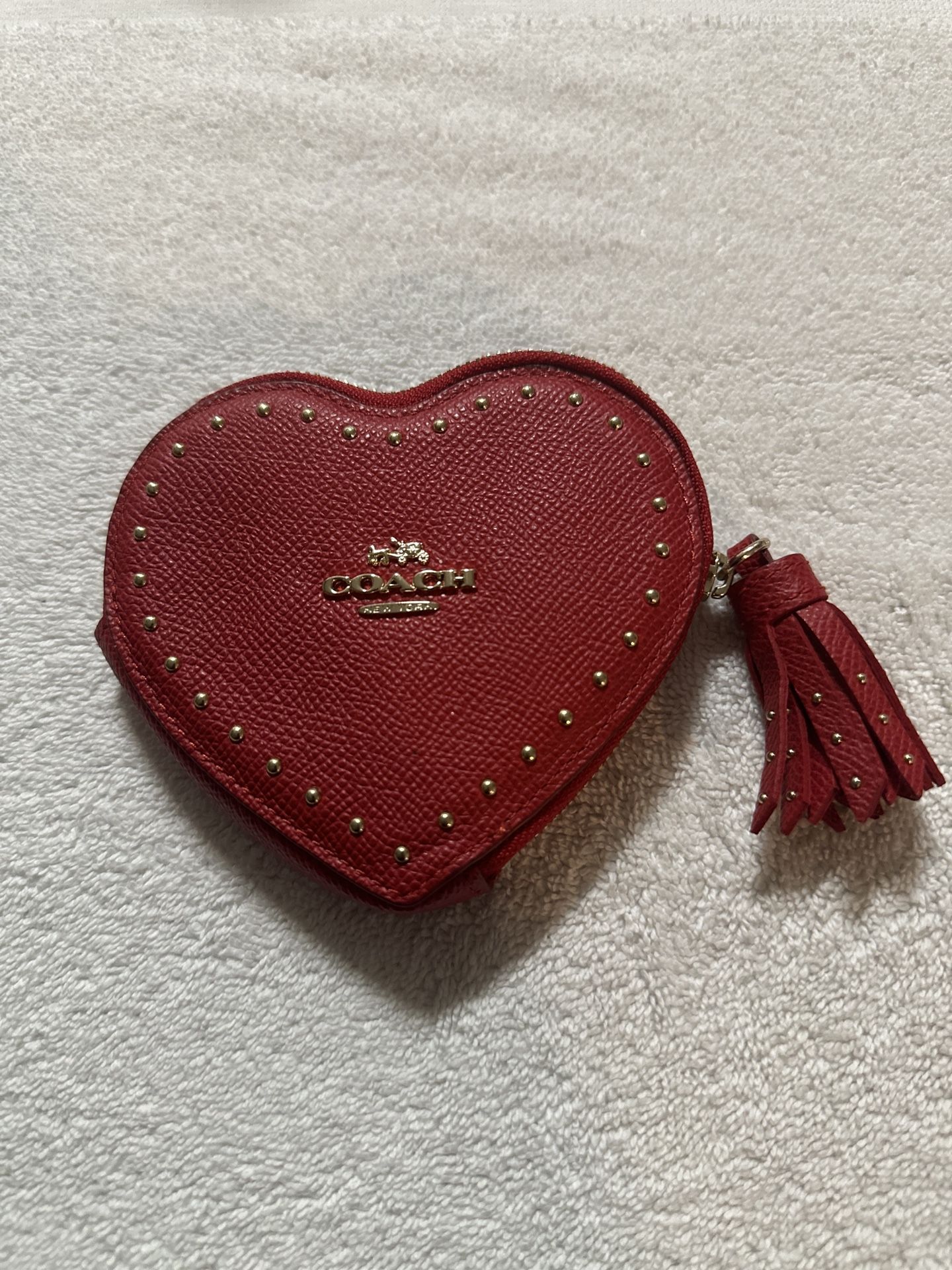This COACH Pebbled Leather Heart Coin Purse 65491B is a heart-shaped coin purse made of crossgrain leather. Show some heart. The charming heart-shaped coin purse from COACH is styled in beautiful polished red pebble leather. Never used. No tags or original packaging. Still an excellent gift! Material: Crossgrain leather. Design details: Heart-shaped with studded edges and a studded tassel on the zipper pull. Hardware: Silver-toned. Interior: Red fabric lining. Dimensions: Approximately 4 1/2" (L) x 4" (H) x 3/4" (W).