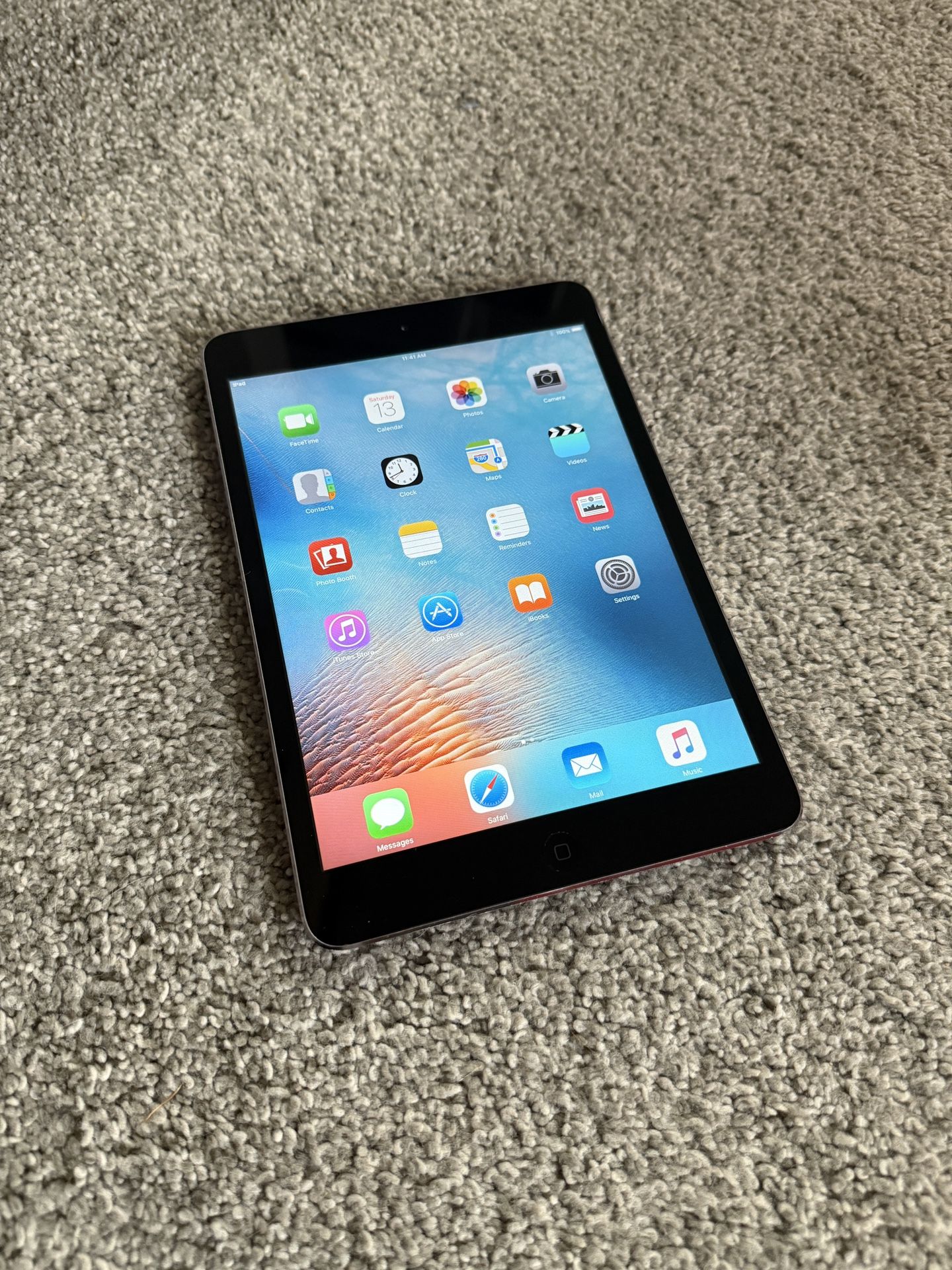 Selling an older iPad Mini 1 has been reset and updated to the maximum iOS it can support. Works and functions great. The battery holds a good charge. iPad is used however great condition and well taken care of. iCloud has been removed and is ready for set-up. 16GB storage Wi-Fi only. Works with iMessage and FaceTime! Charging cable included. Feel free to ask any questions.